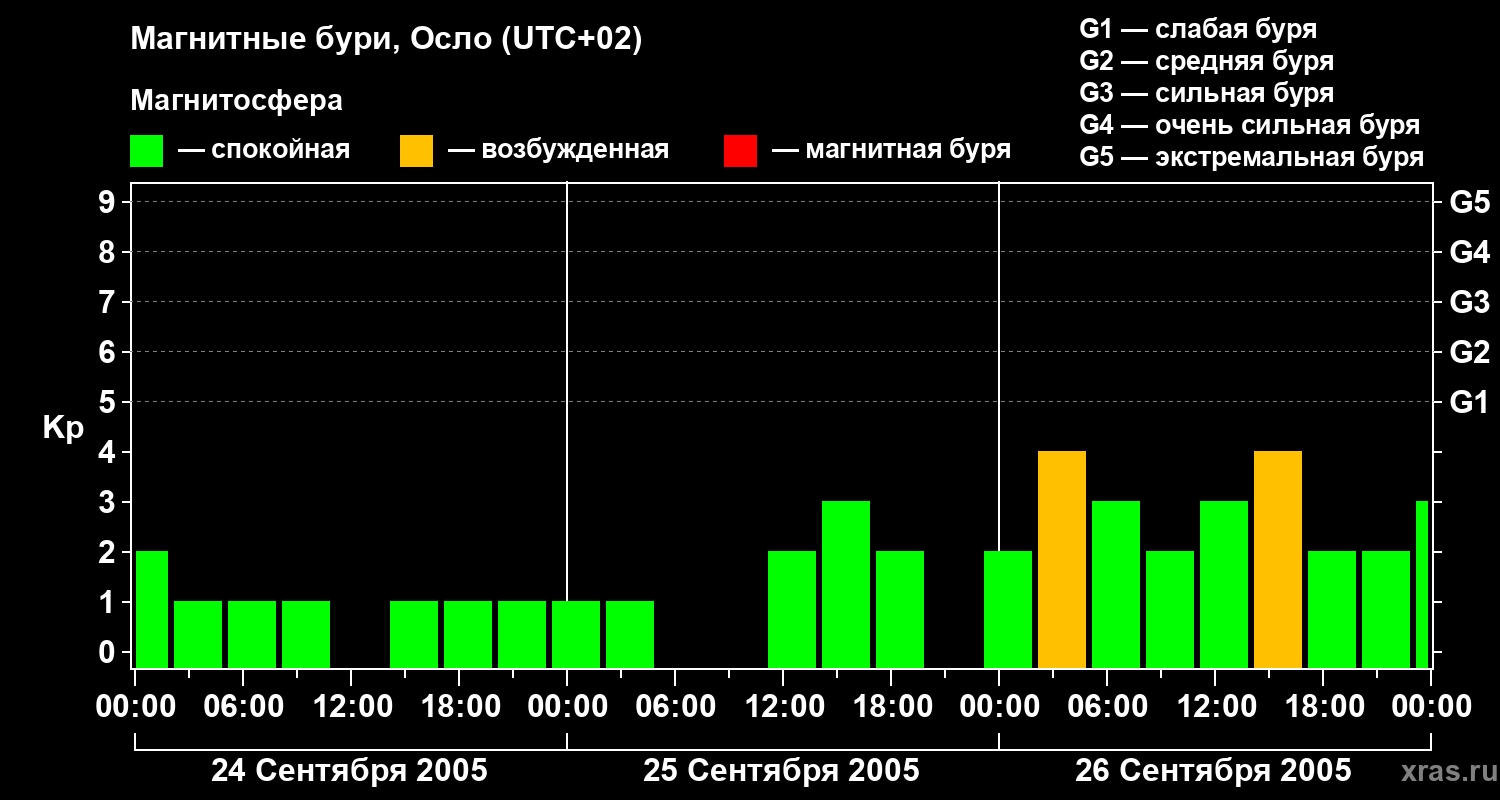 Изменения геомагнитного индекса Kp с 24 по 26 сентября 2005 года для средних широт