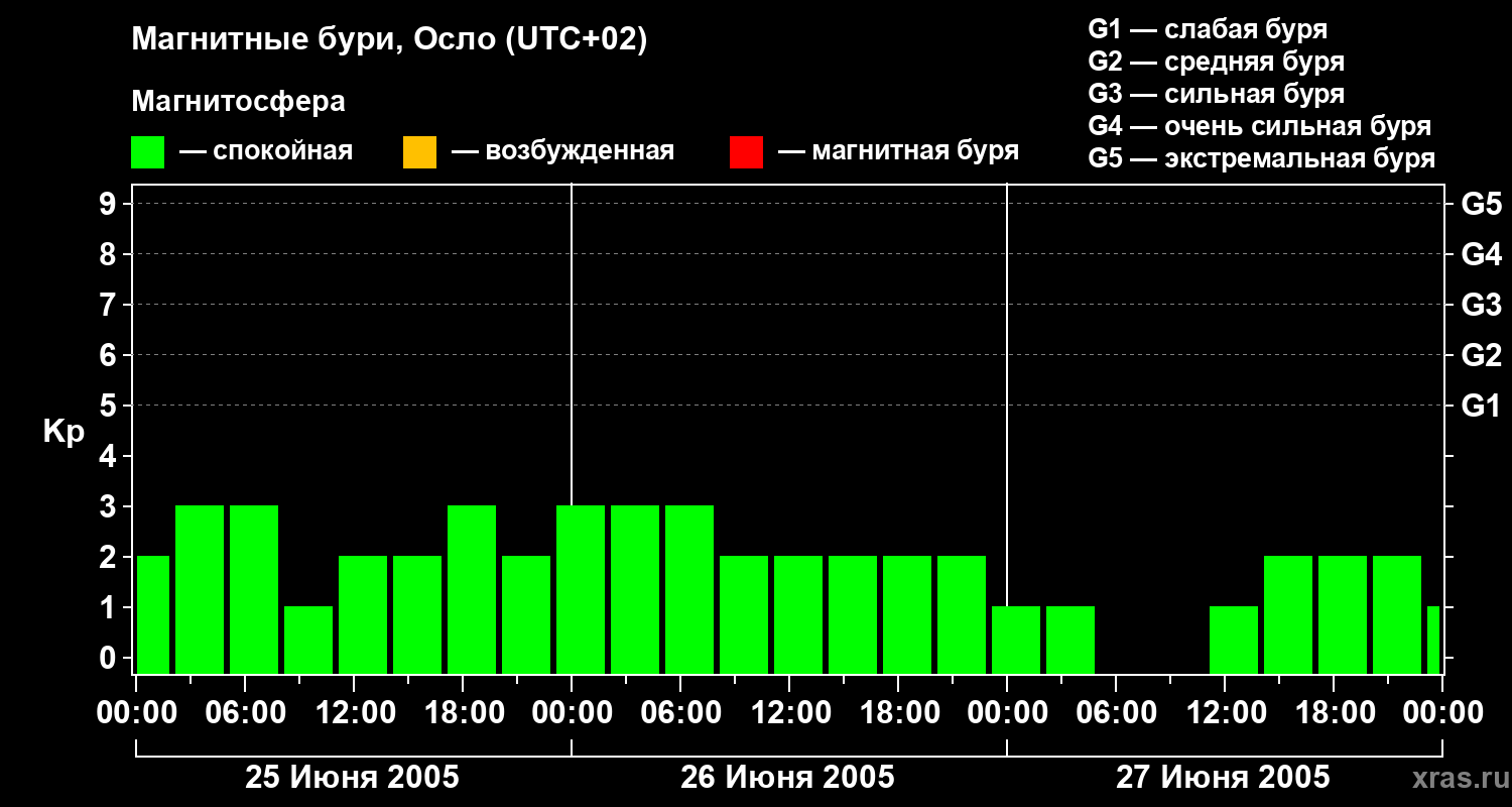 Изменения геомагнитного индекса Kp с 25 по 27 июня 2005 года для средних широт
