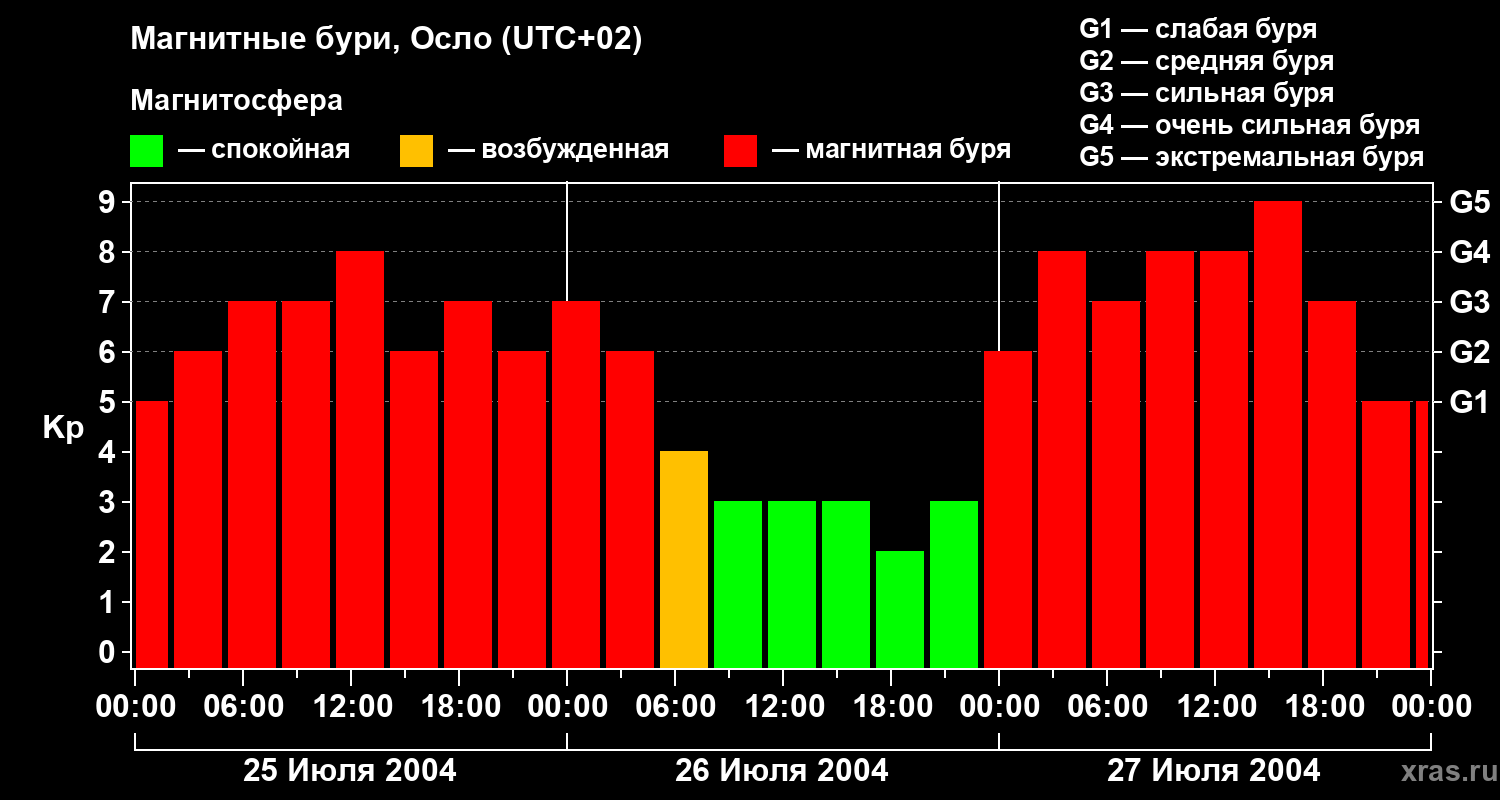 Изменения геомагнитного индекса Kp с 25 по 27 июля 2004 года для средних широт