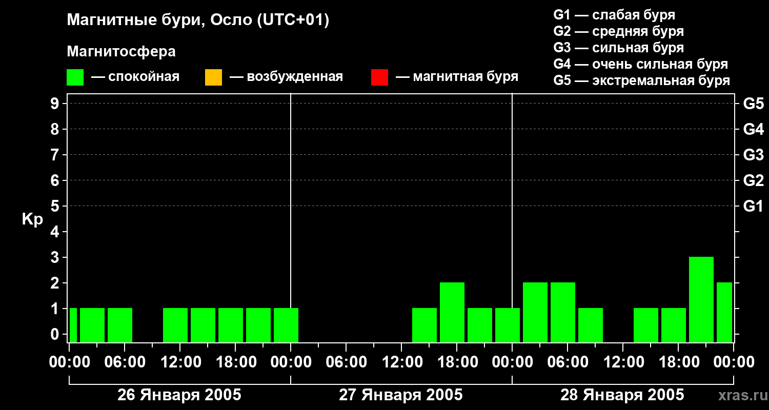 Изменения геомагнитного индекса Kp с 26 по 28 января 2005 года для средних широт