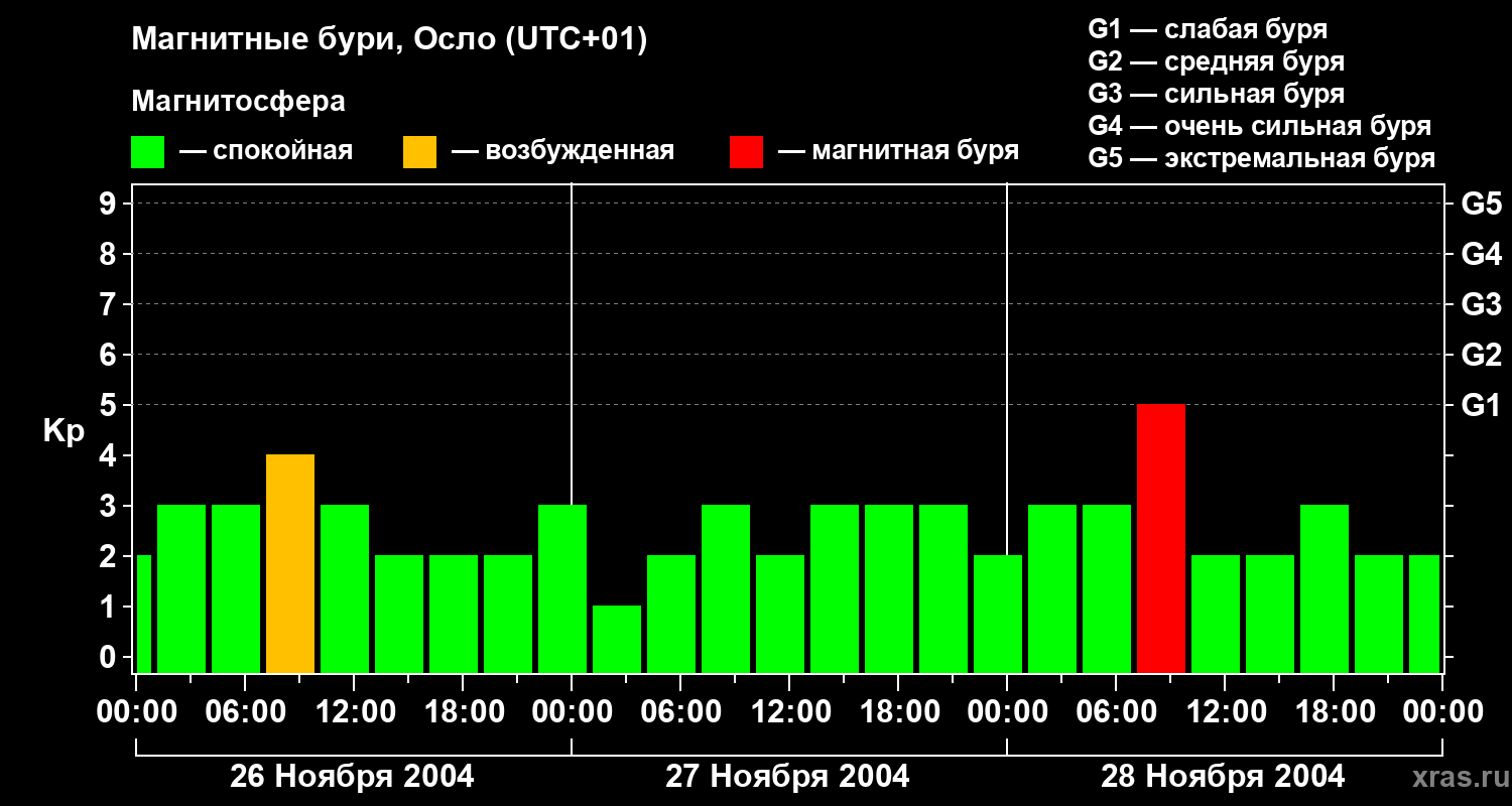 Изменения геомагнитного индекса Kp с 26 по 28 ноября 2004 года для средних широт