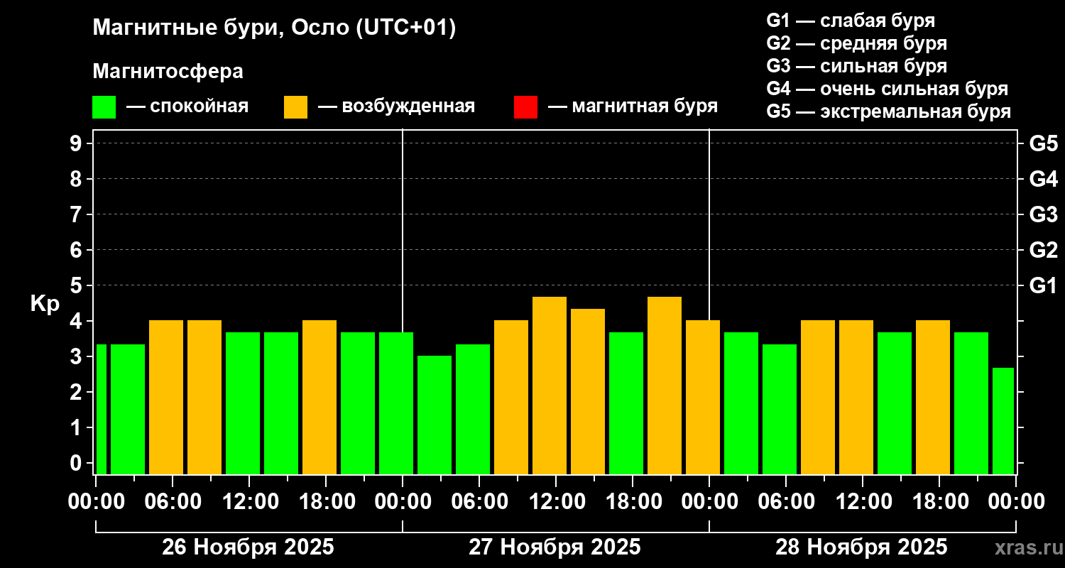 Изменения геомагнитного индекса Kp с 26 по 28 ноября 2025 года для средних широт
