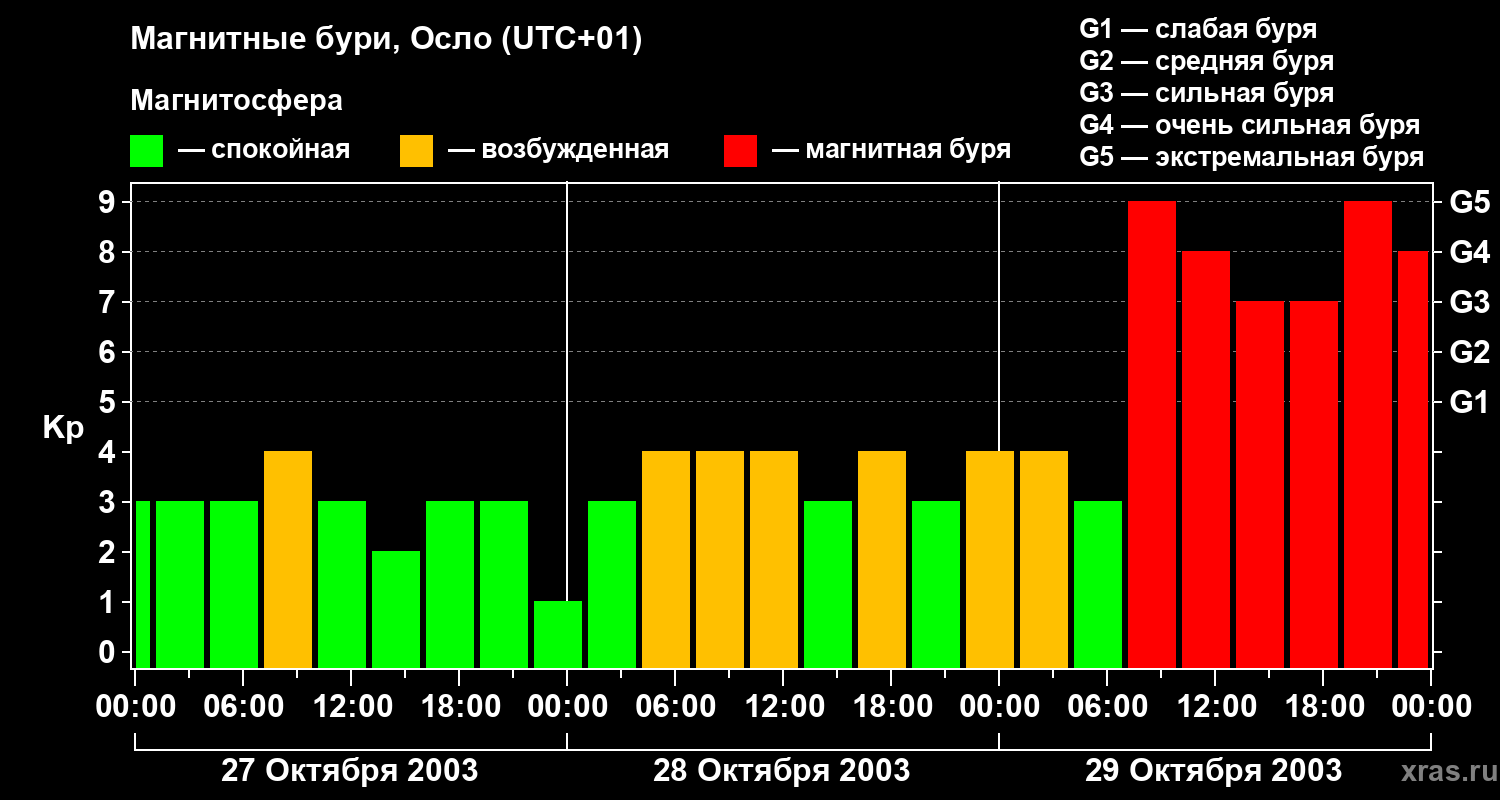 Изменения геомагнитного индекса Kp с 27 по 29 октября 2003 года для средних широт