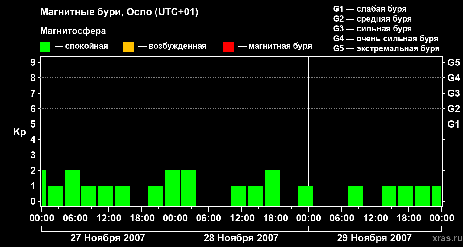 Изменения геомагнитного индекса Kp с 27 по 29 ноября 2007 года для средних широт