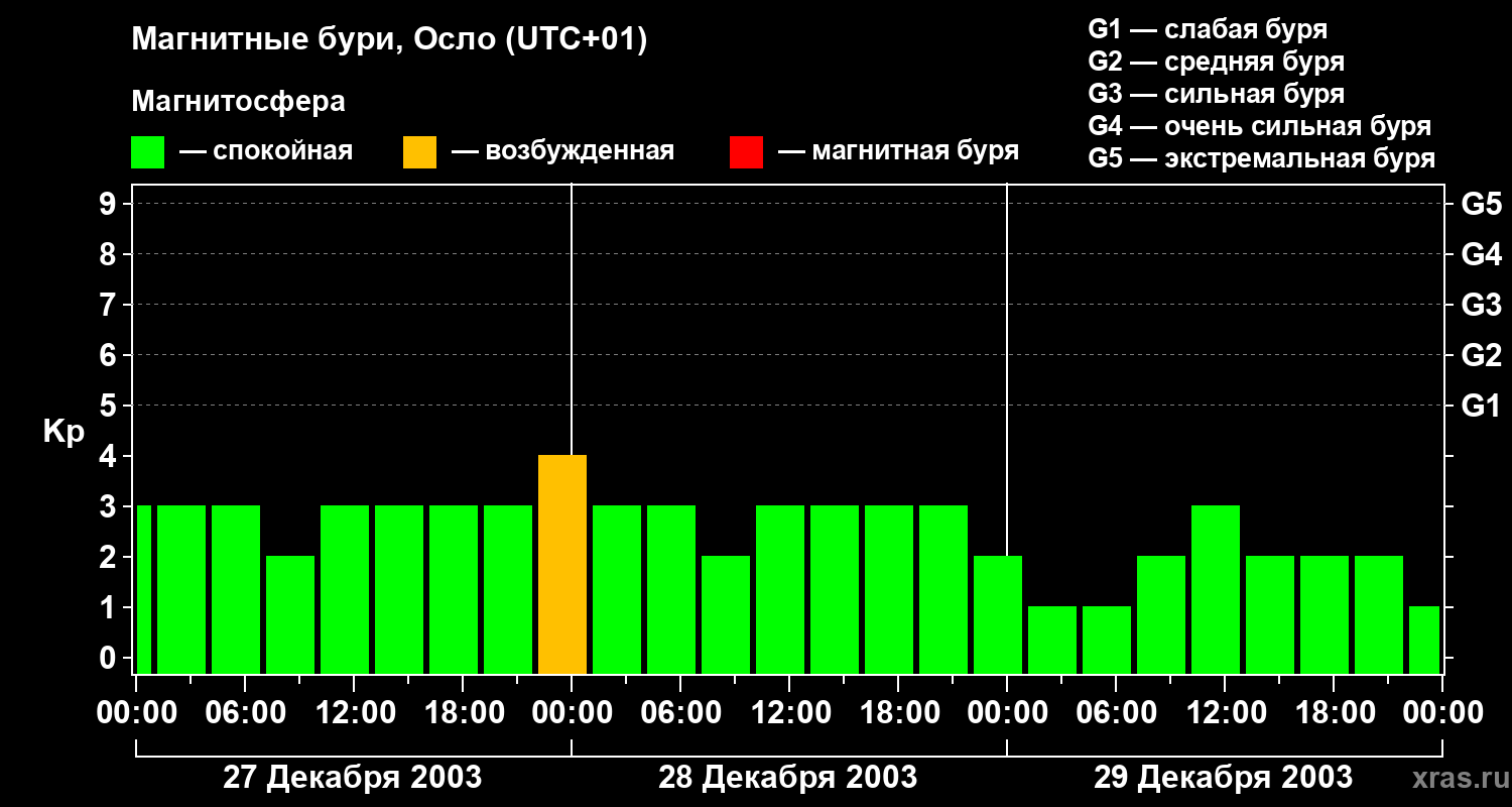 Изменения геомагнитного индекса Kp с 27 по 29 декабря 2003 года для средних широт