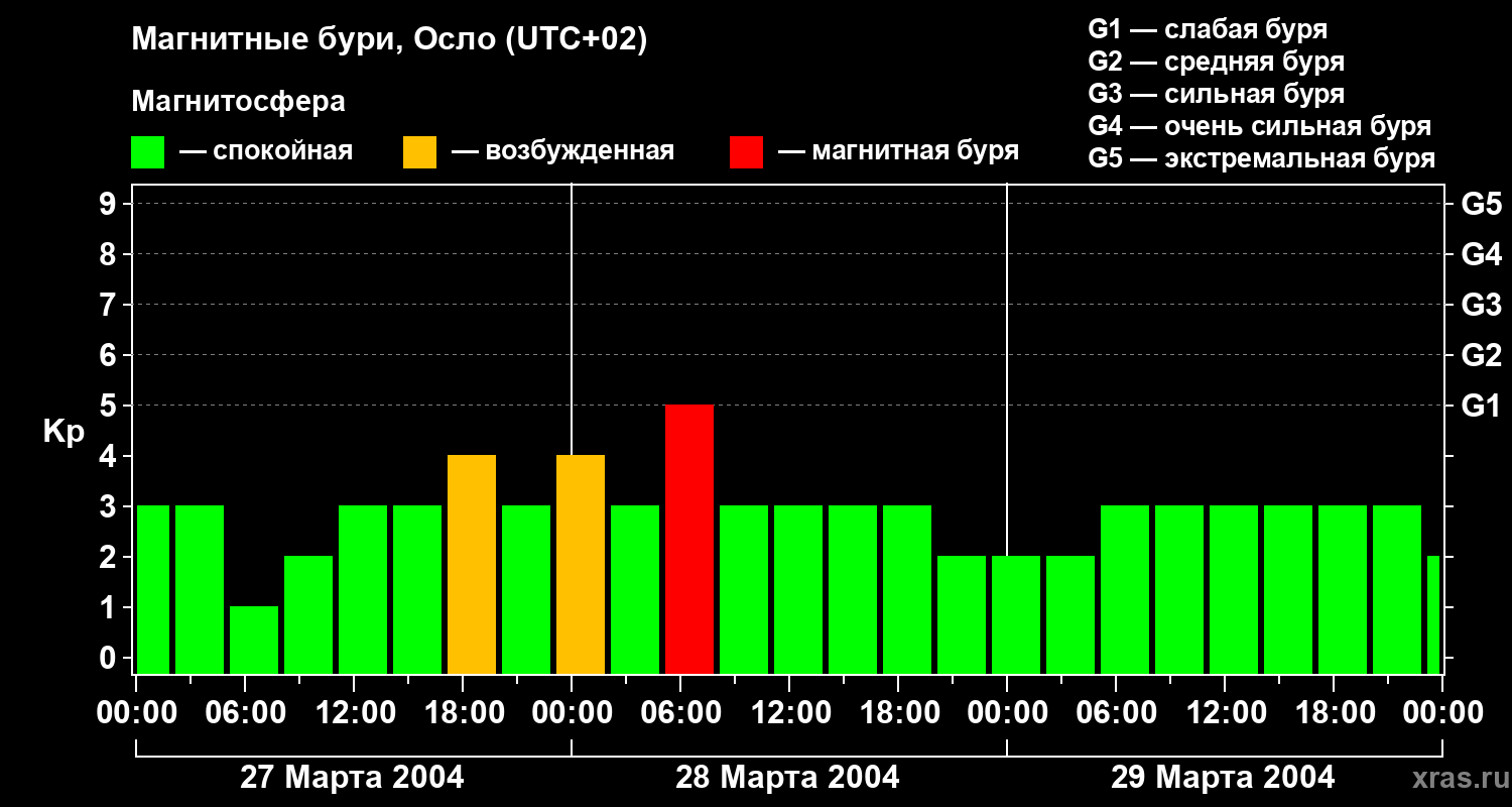 Изменения геомагнитного индекса Kp с 27 по 29 марта 2004 года для средних широт