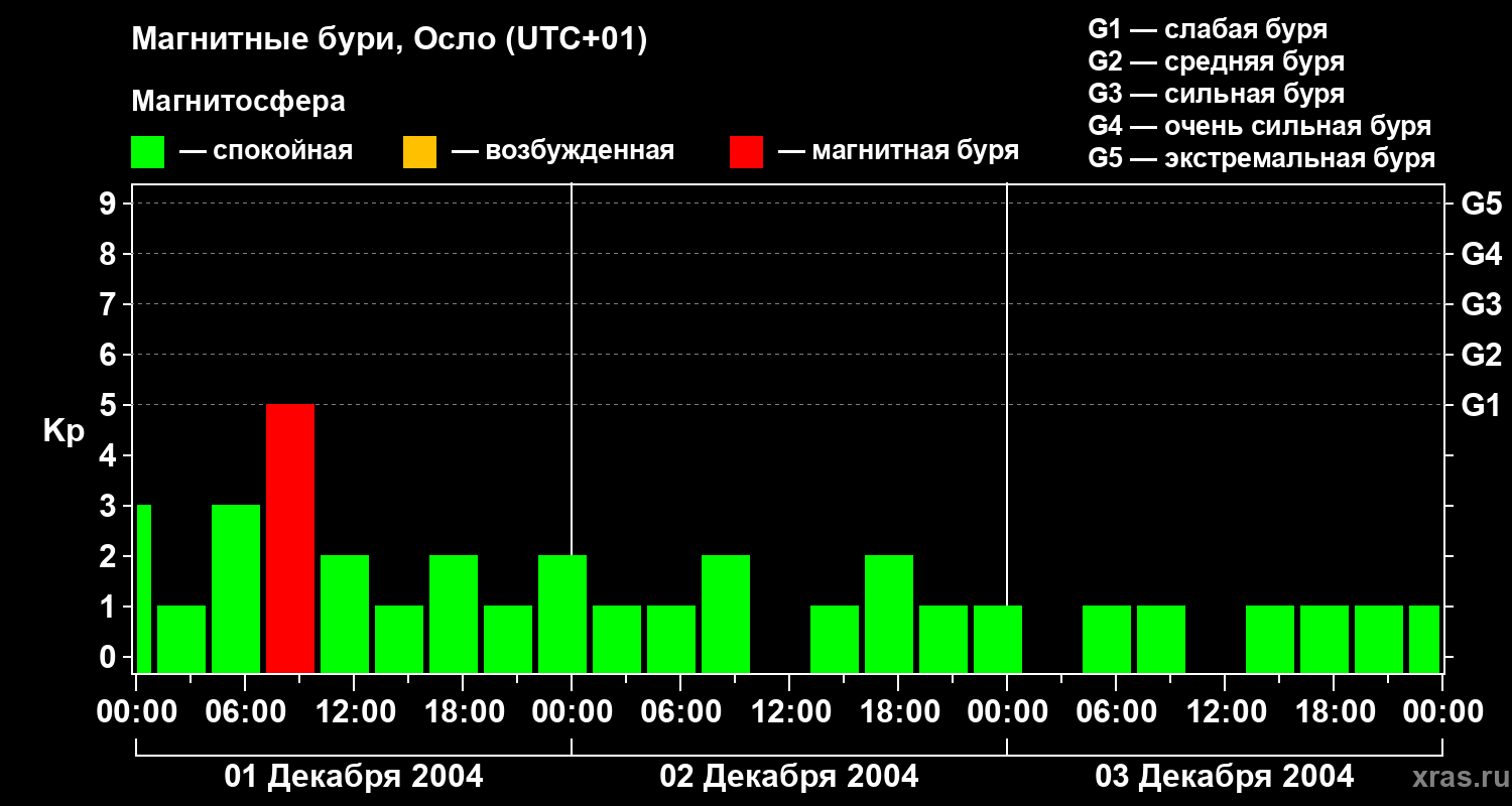 Изменения геомагнитного индекса Kp с 1 по 3 декабря 2004 года для средних широт