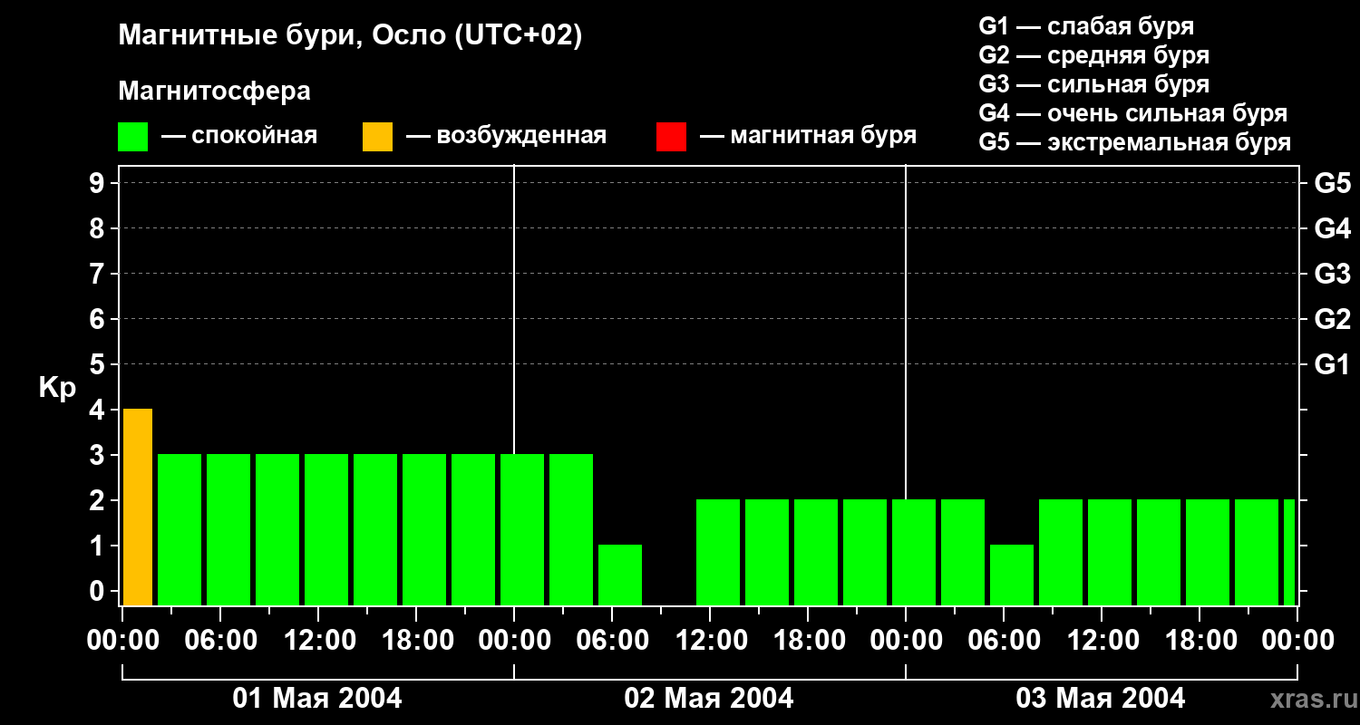 Изменения геомагнитного индекса Kp с 1 по 3 мая 2004 года для средних широт