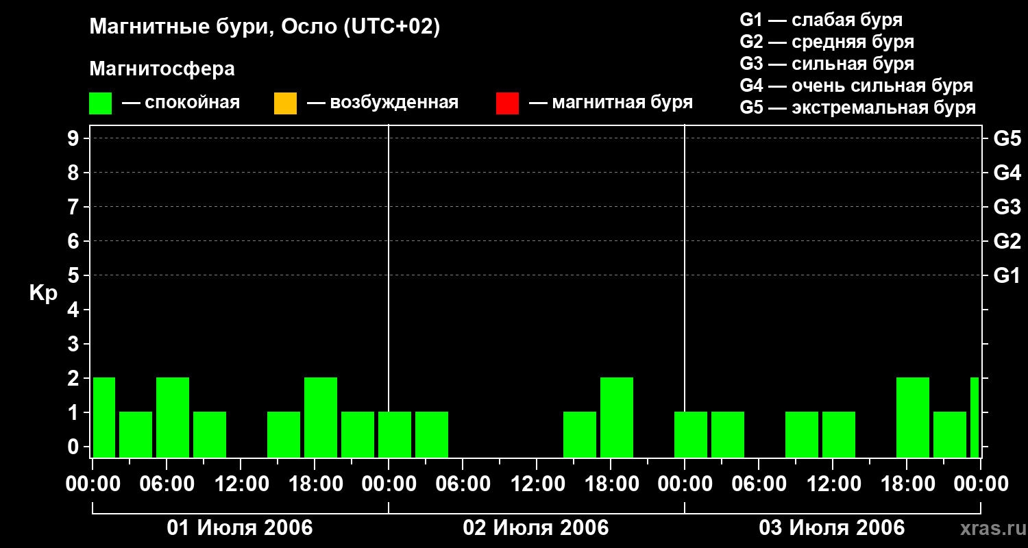 Изменения геомагнитного индекса Kp с 1 по 3 июля 2006 года для средних широт