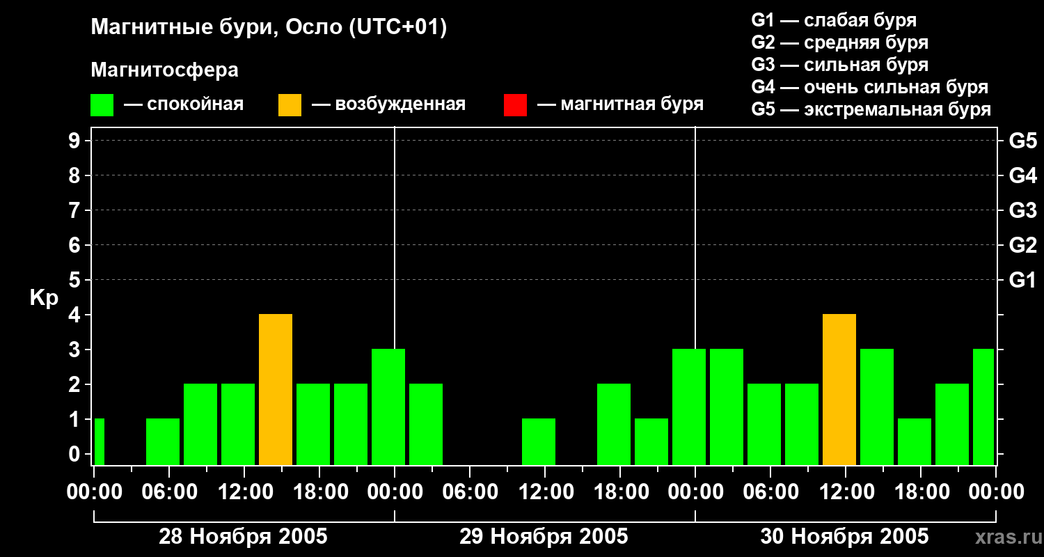 Изменения геомагнитного индекса Kp с 28 по 30 ноября 2005 года для средних широт