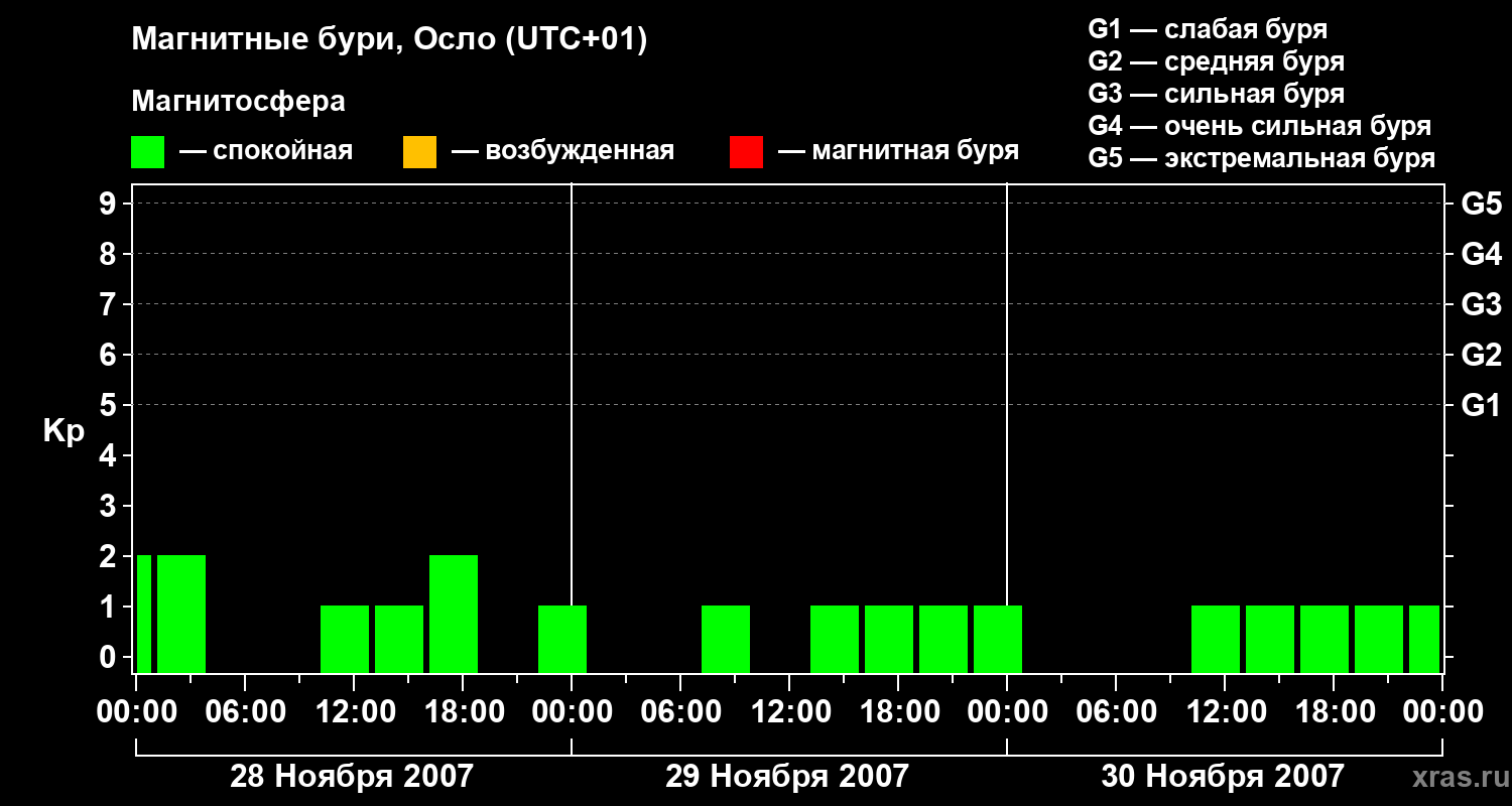 Изменения геомагнитного индекса Kp с 28 по 30 ноября 2007 года для средних широт