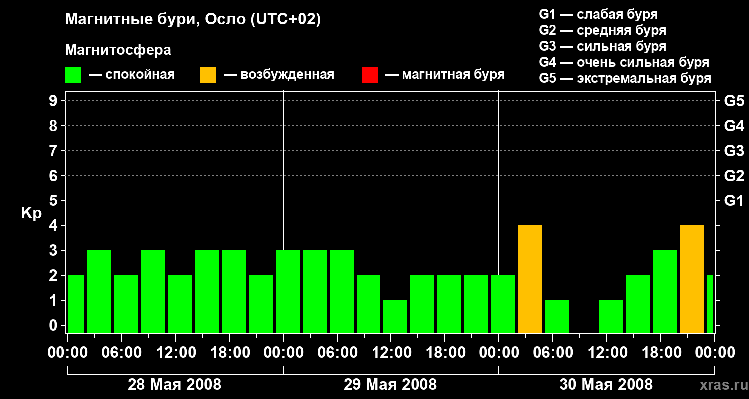 Изменения геомагнитного индекса Kp с 28 по 30 мая 2008 года для средних широт