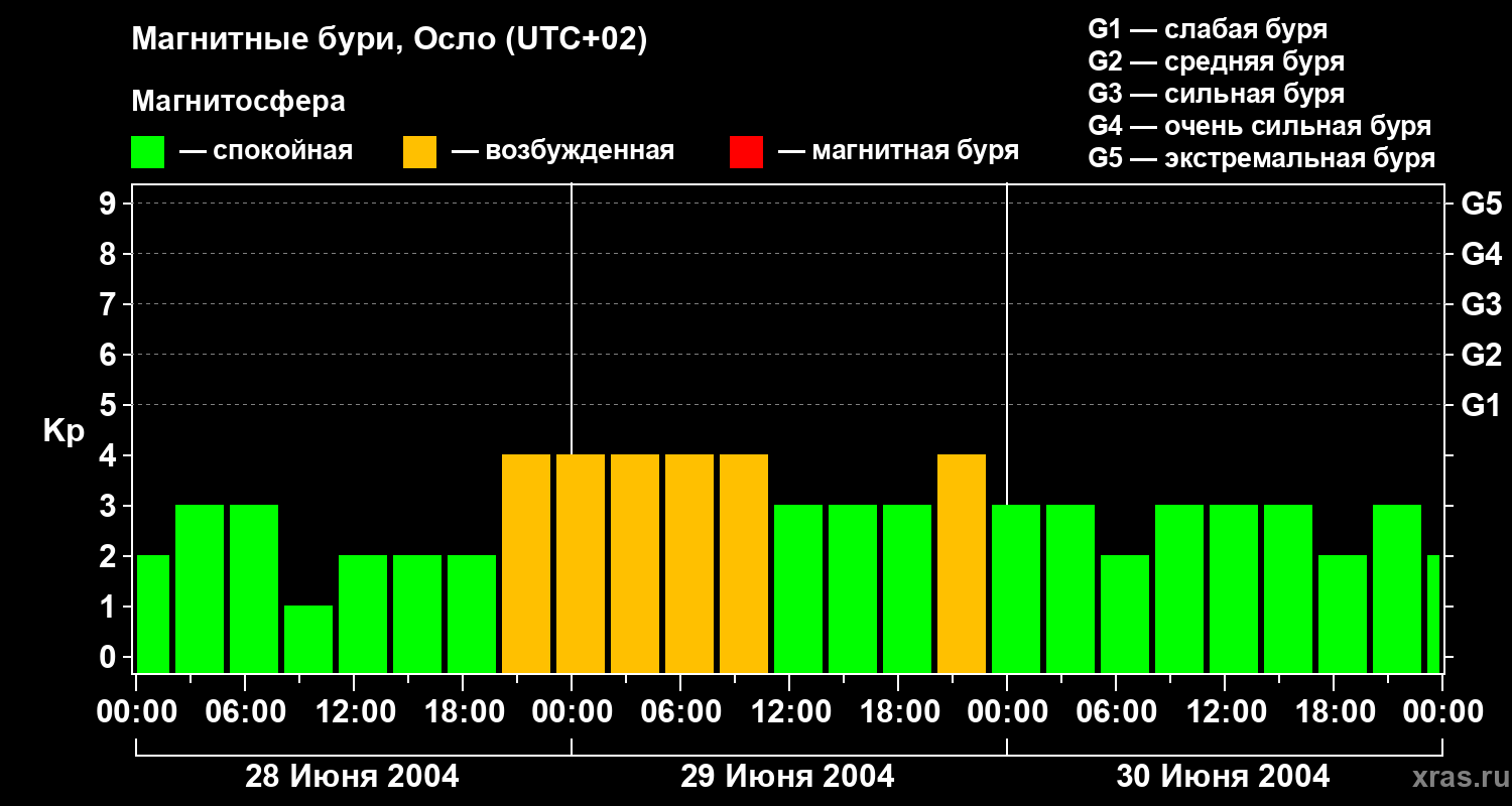 Изменения геомагнитного индекса Kp с 28 по 30 июня 2004 года для средних широт