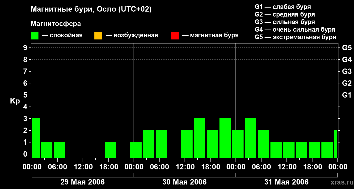 Изменения геомагнитного индекса Kp с 29 по 31 мая 2006 года для средних широт