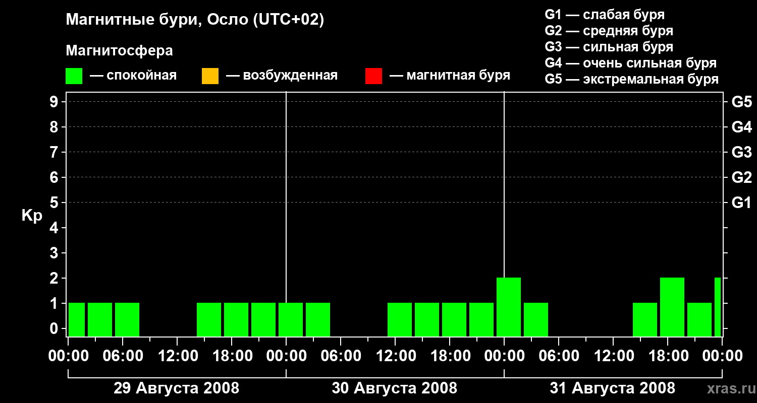 Изменения геомагнитного индекса Kp с 29 по 31 августа 2008 года для средних широт