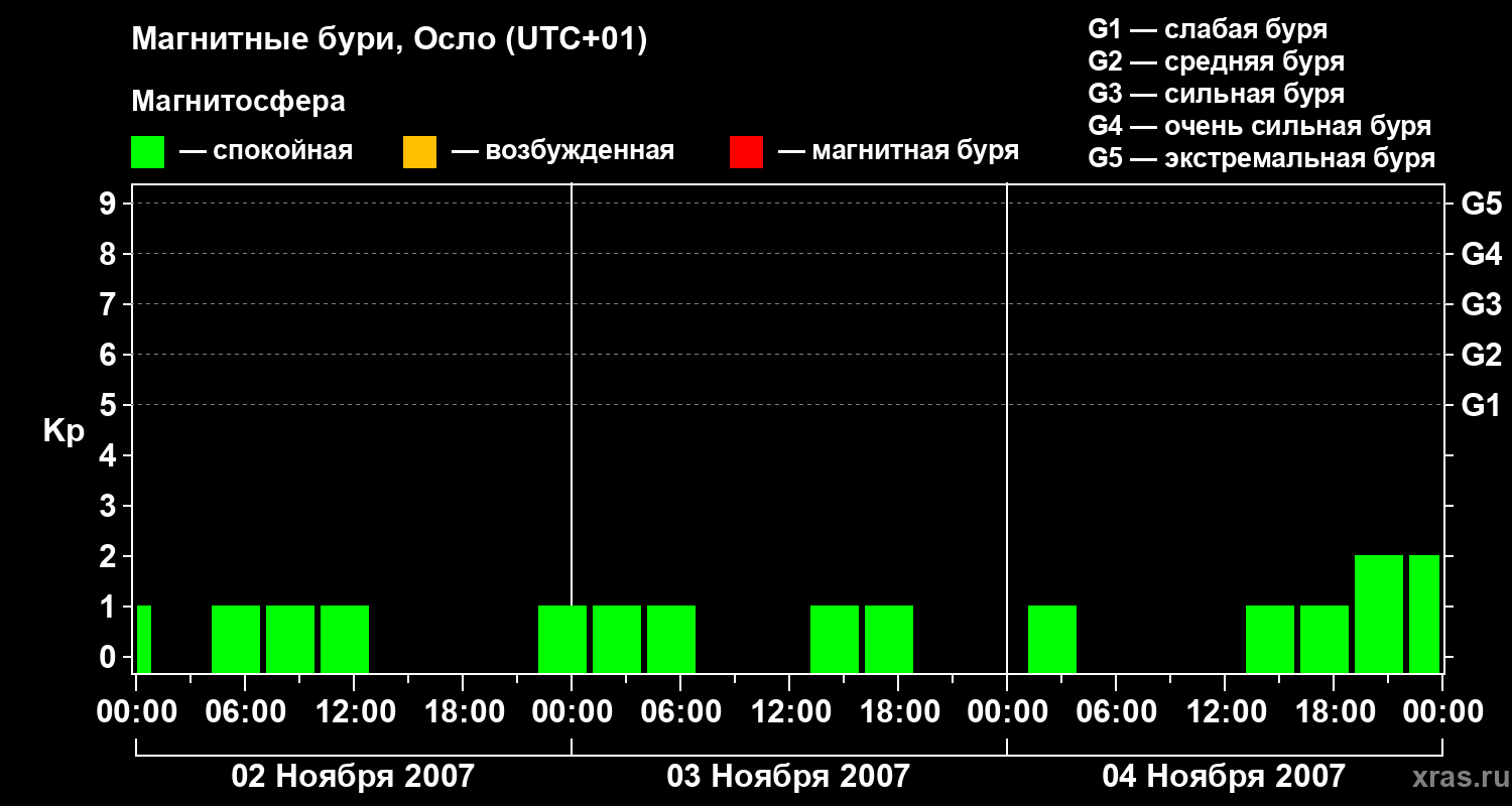 Изменения геомагнитного индекса Kp с 2 по 4 ноября 2007 года для средних широт