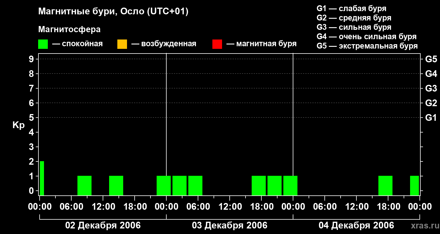 Изменения геомагнитного индекса Kp с 2 по 4 декабря 2006 года для средних широт