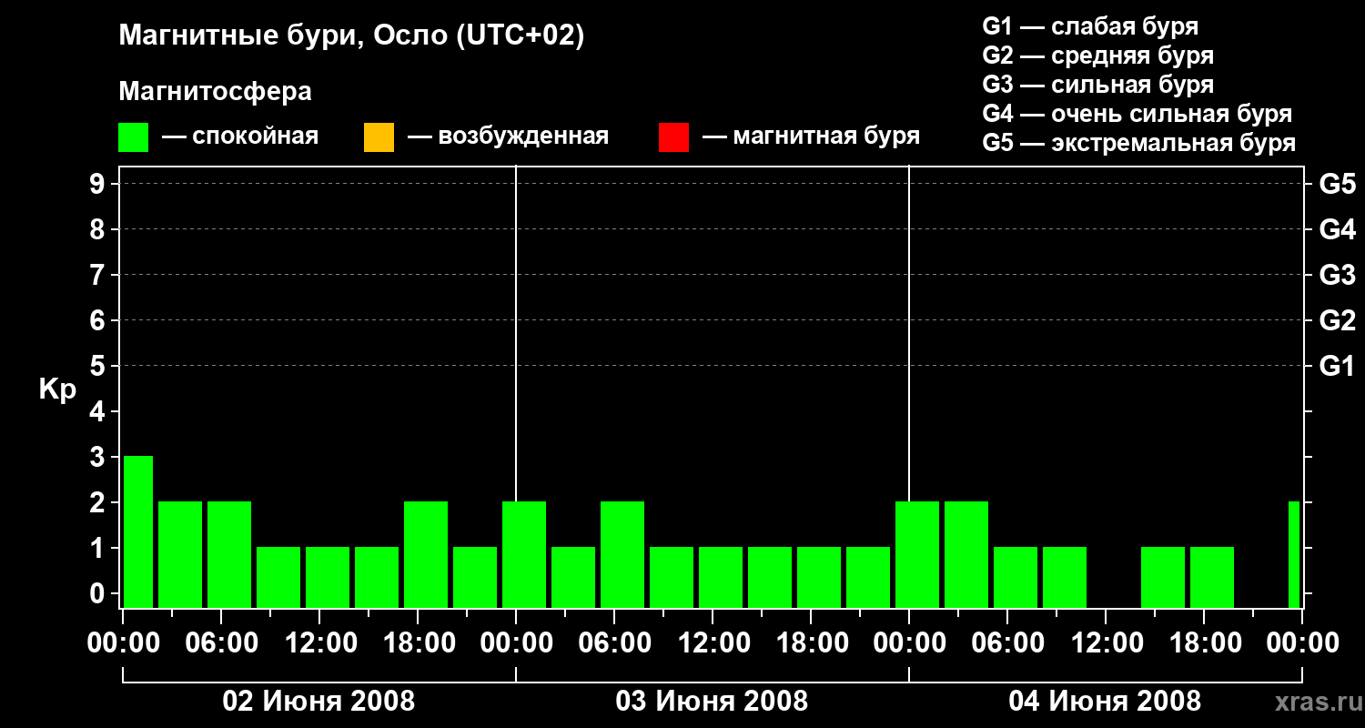 Изменения геомагнитного индекса Kp с 2 по 4 июня 2008 года для средних широт
