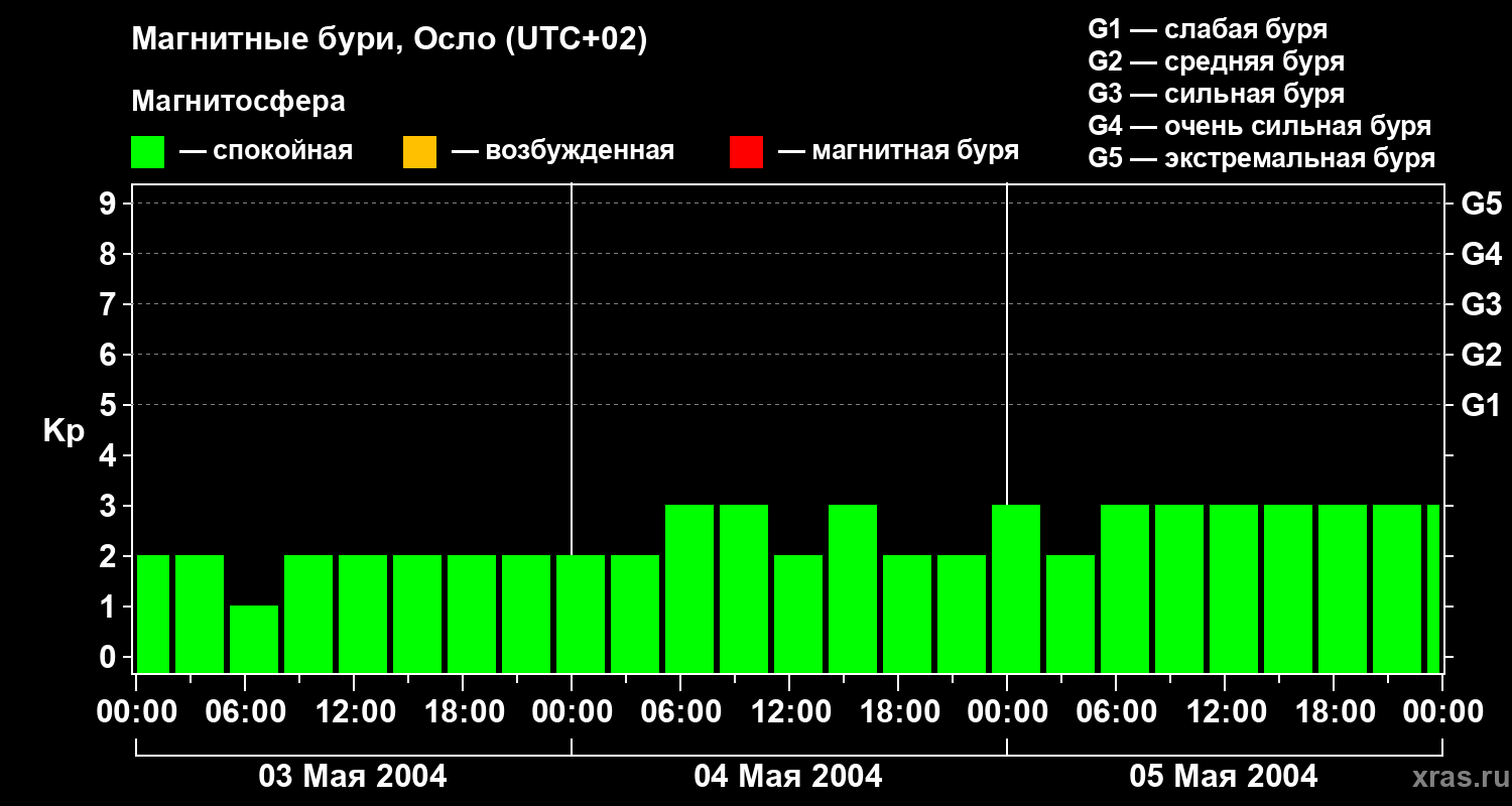 Изменения геомагнитного индекса Kp с 3 по 5 мая 2004 года для средних широт