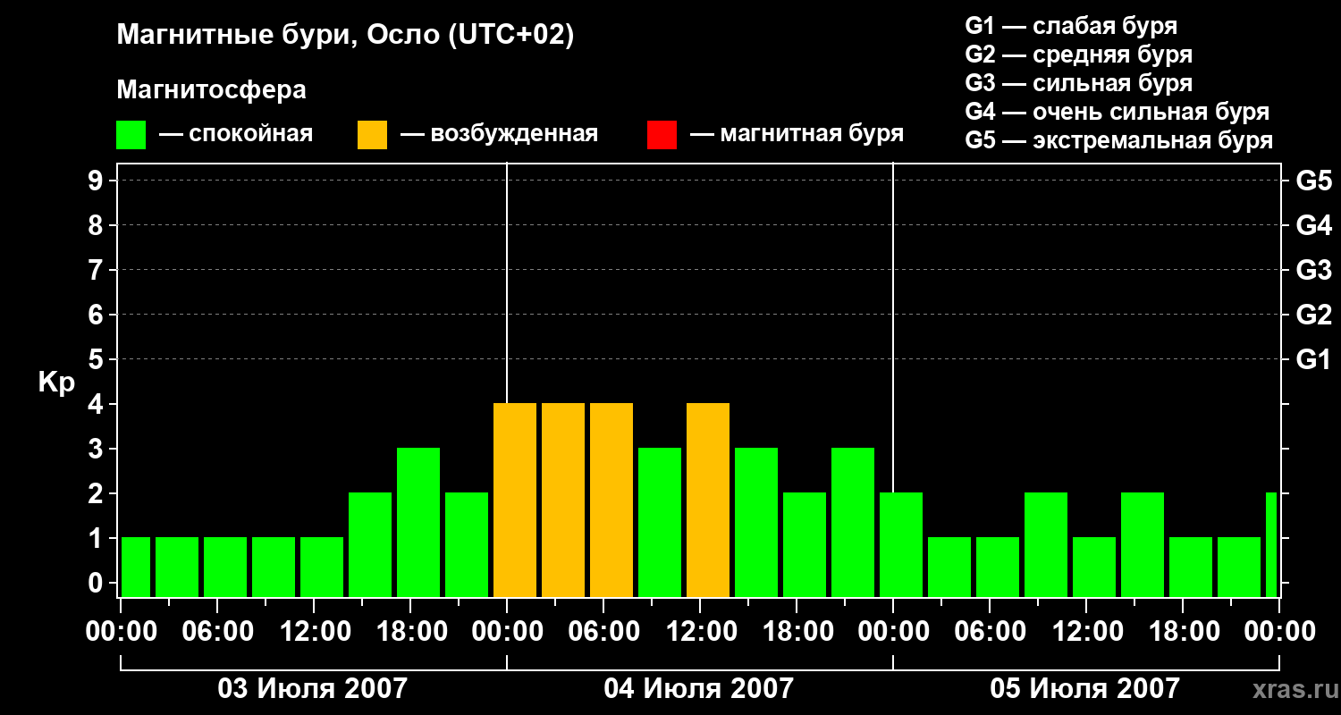 Изменения геомагнитного индекса Kp с 3 по 5 июля 2007 года для средних широт