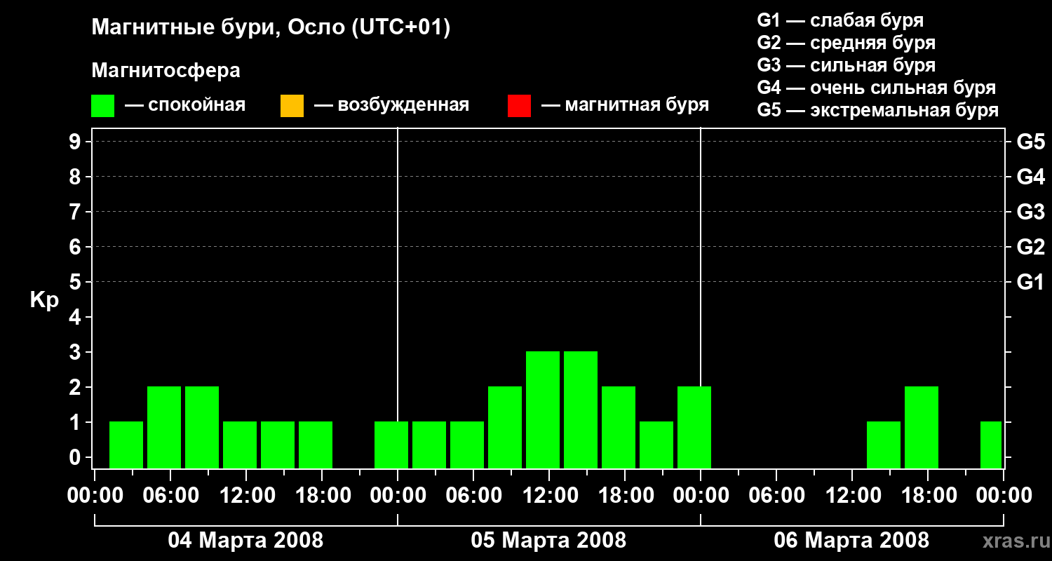 Изменения геомагнитного индекса Kp с 4 по 6 марта 2008 года для средних широт