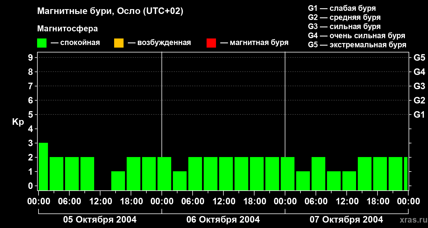 Изменения геомагнитного индекса Kp с 5 по 7 октября 2004 года для средних широт