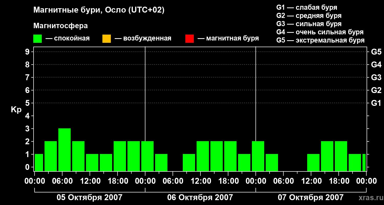 Изменения геомагнитного индекса Kp с 5 по 7 октября 2007 года для средних широт