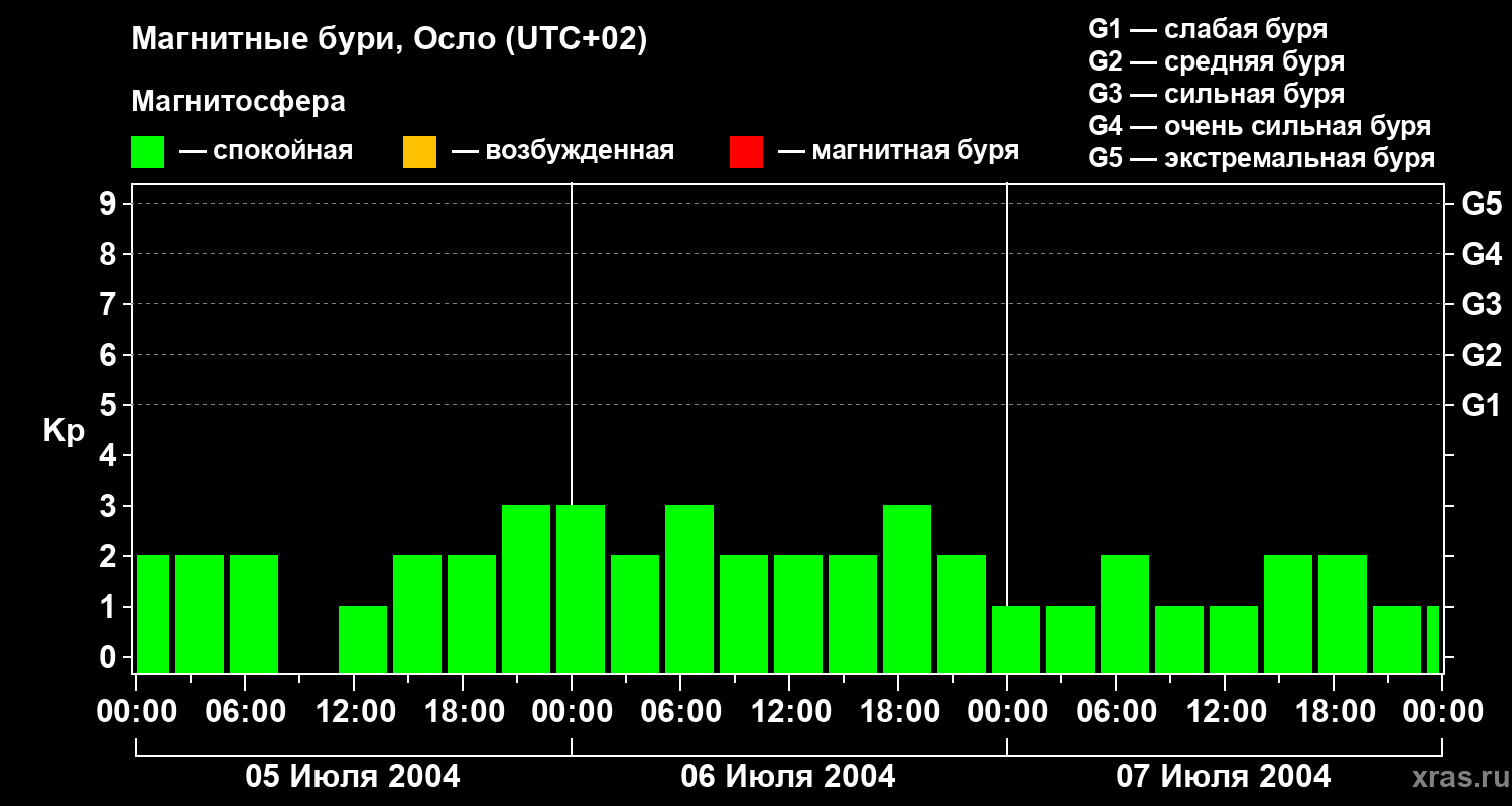 Изменения геомагнитного индекса Kp с 5 по 7 июля 2004 года для средних широт