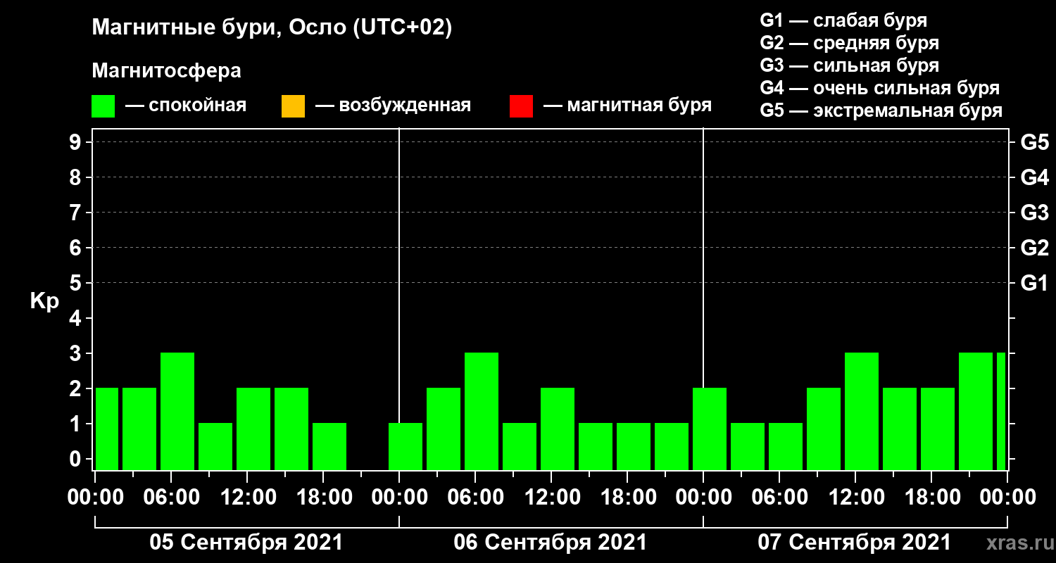 Изменения геомагнитного индекса Kp с 5 по 7 сентября 2021 года для средних широт
