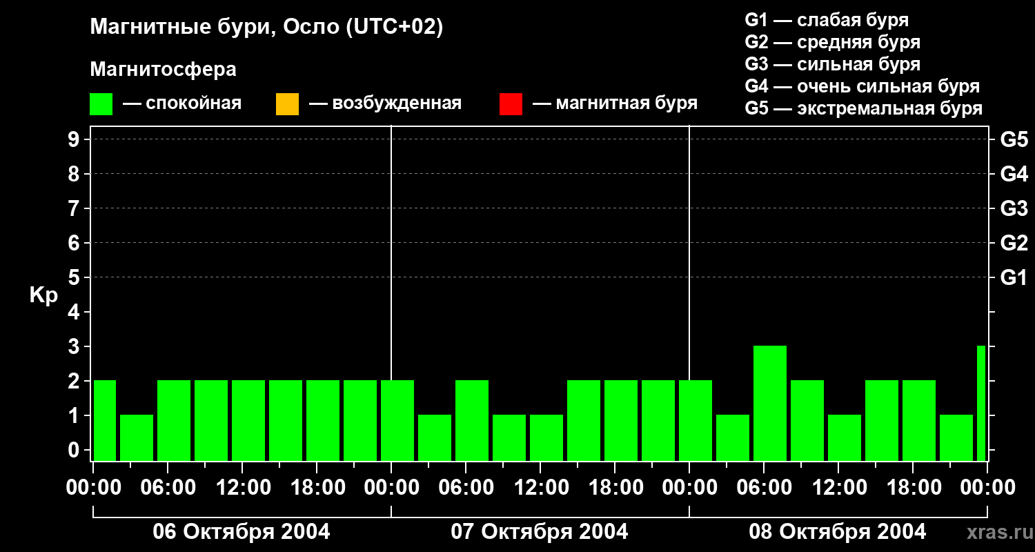 Изменения геомагнитного индекса Kp с 6 по 8 октября 2004 года для средних широт