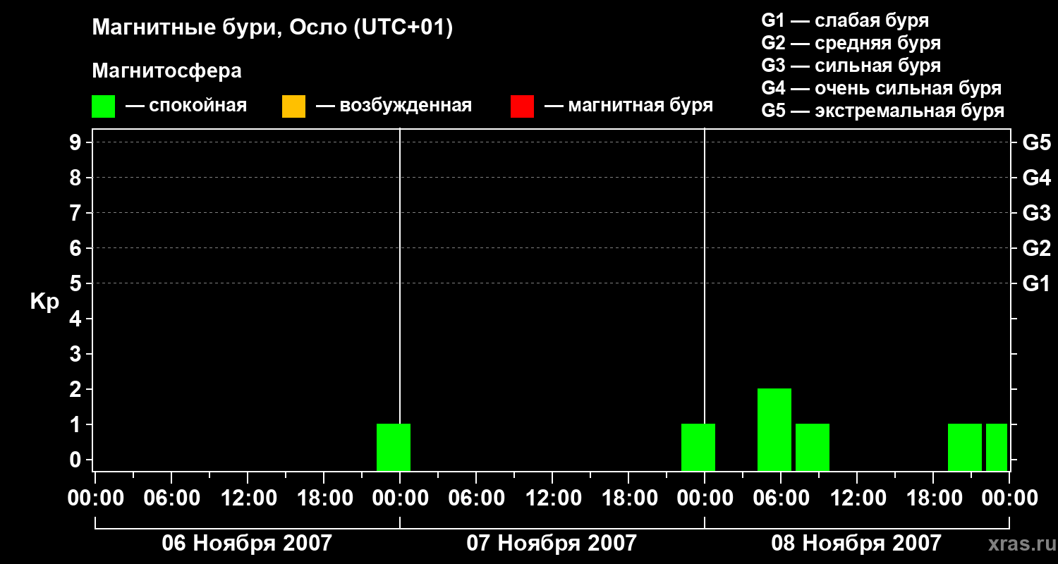 Изменения геомагнитного индекса Kp с 6 по 8 ноября 2007 года для средних широт