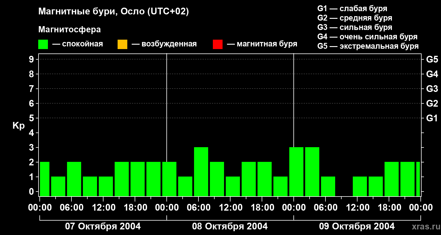 Изменения геомагнитного индекса Kp с 7 по 9 октября 2004 года для средних широт