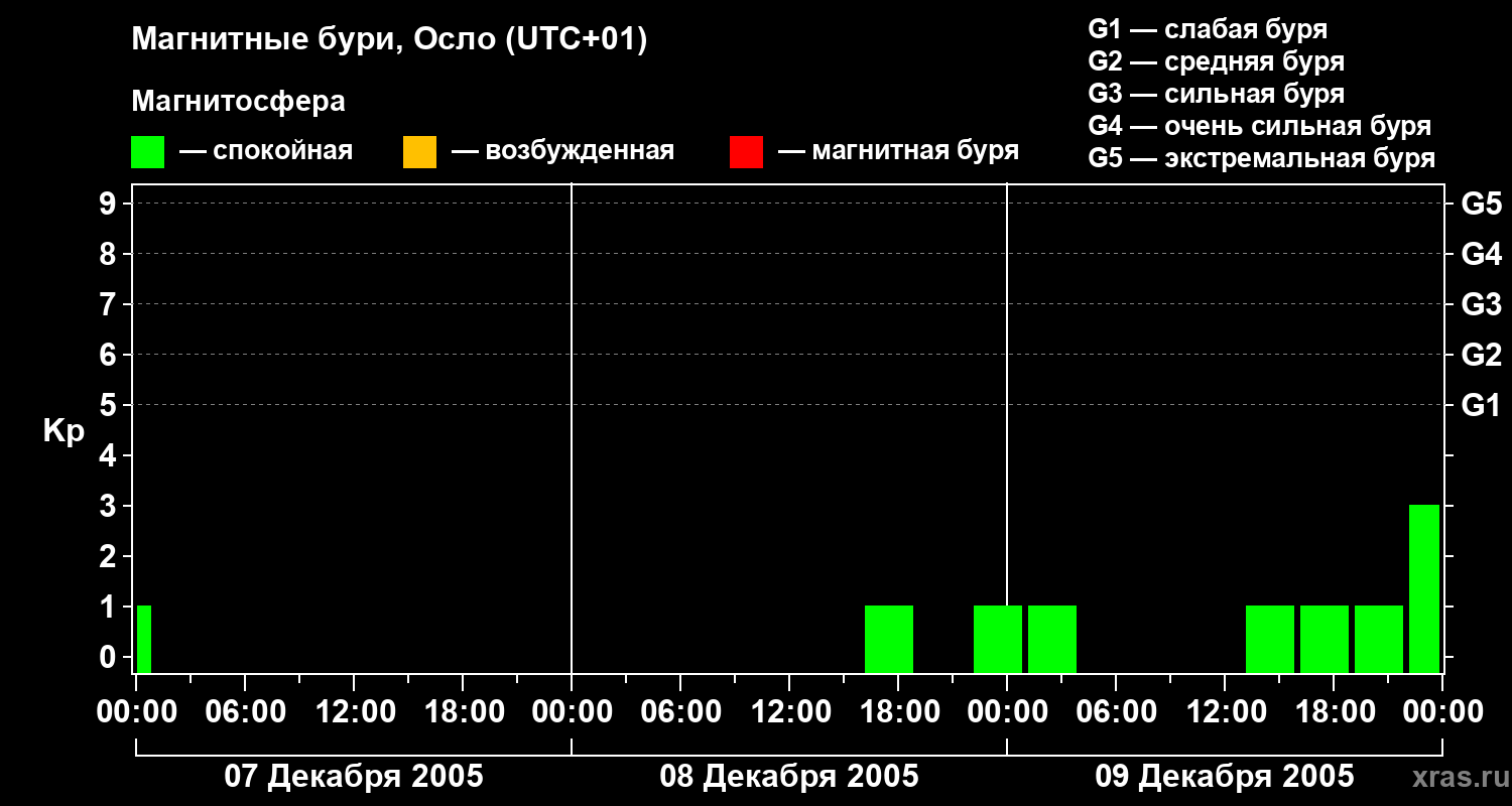 Изменения геомагнитного индекса Kp с 7 по 9 декабря 2005 года для средних широт