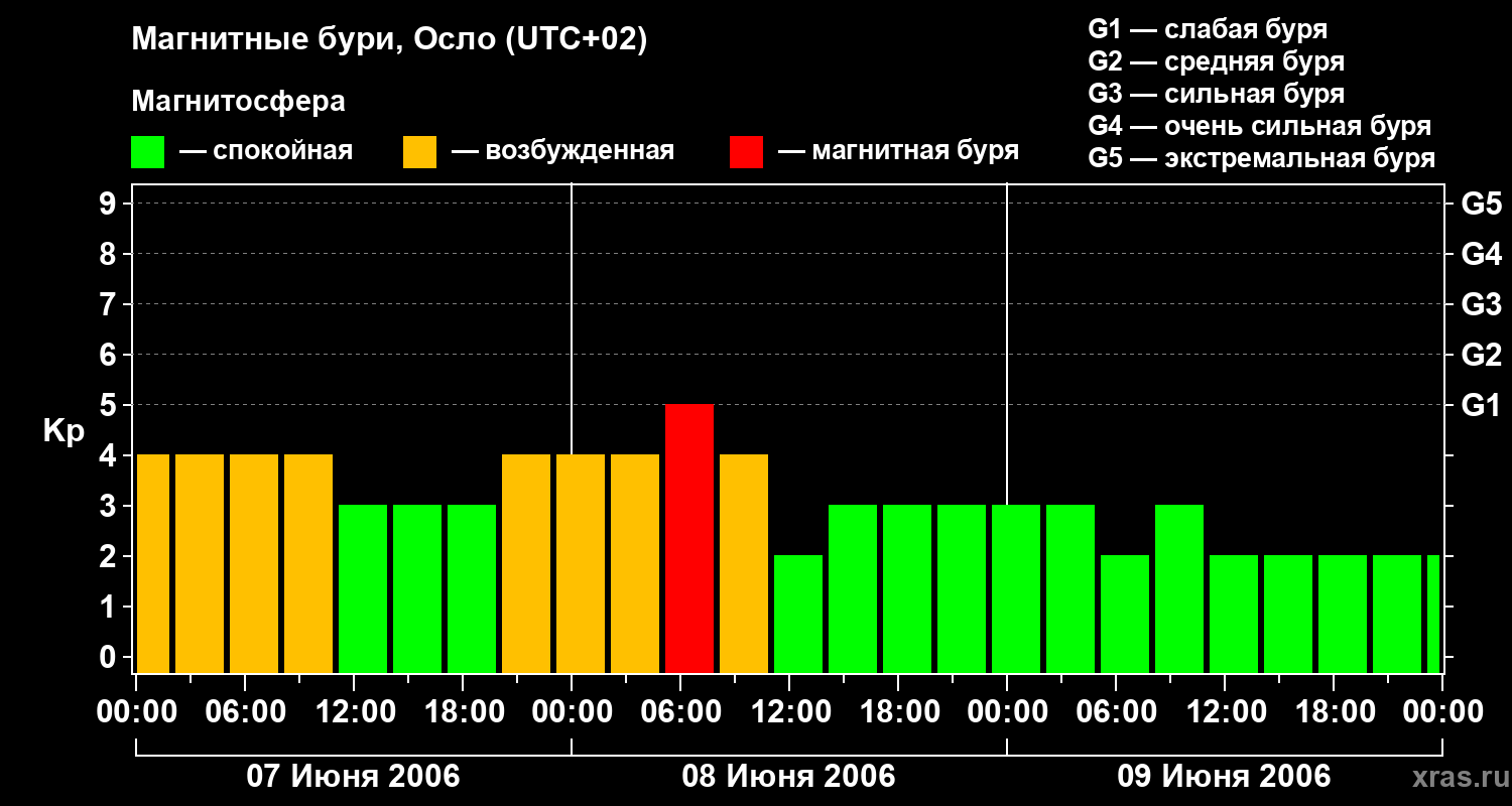 Изменения геомагнитного индекса Kp с 7 по 9 июня 2006 года для средних широт