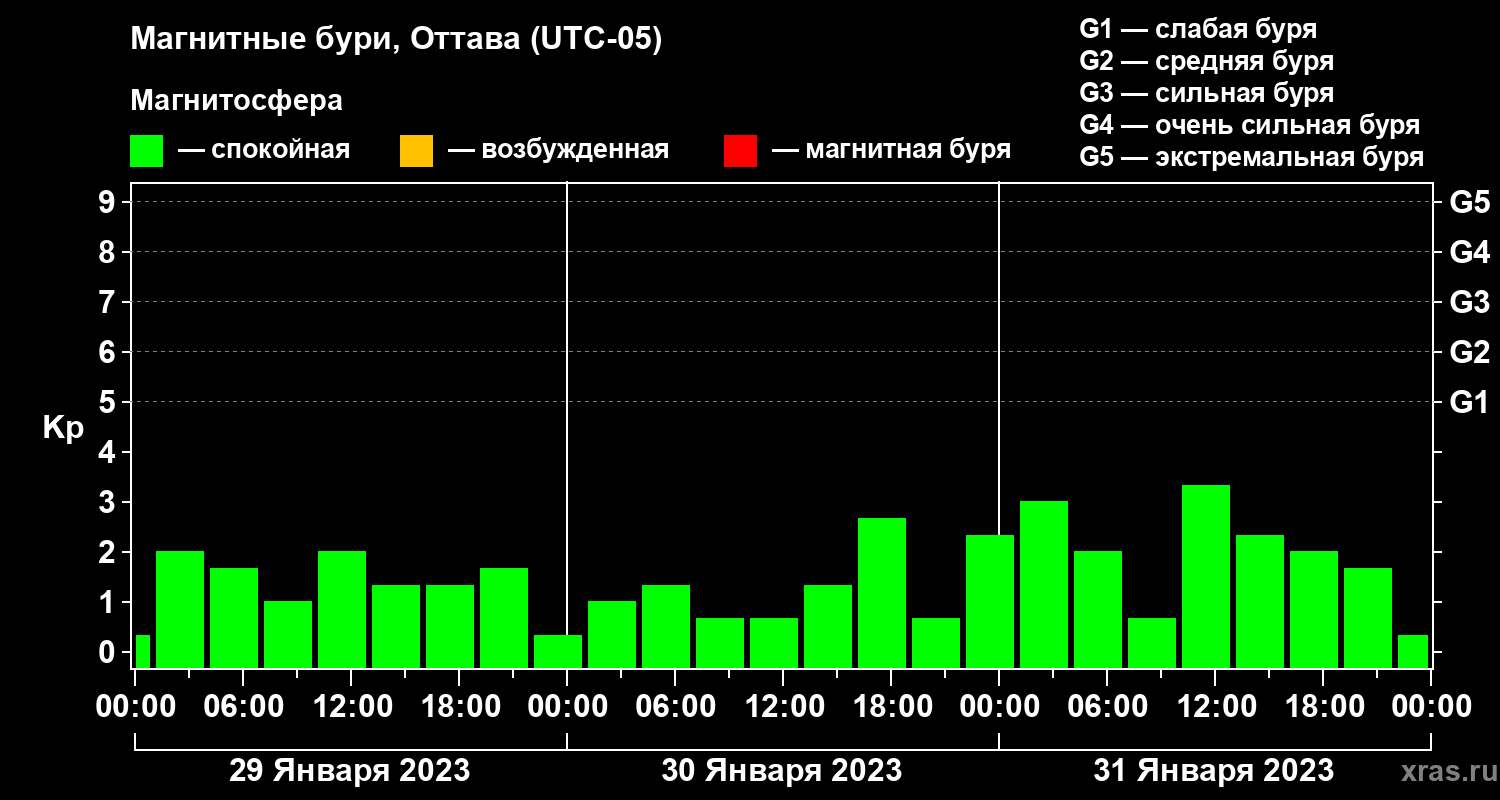 Изменения геомагнитного индекса Kp с 29 по 31 января 2023 года для средних широт