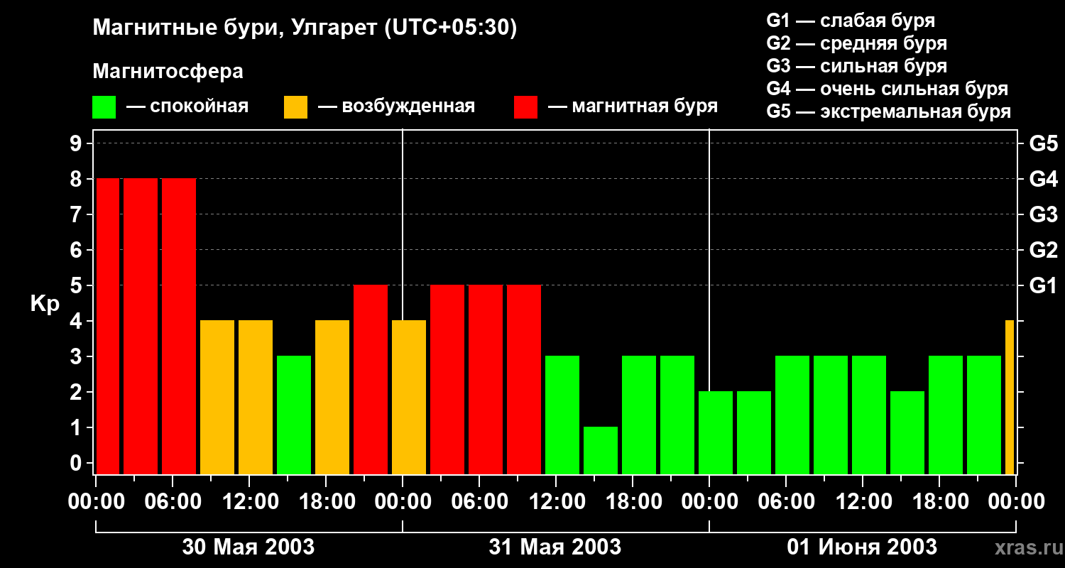 Изменения геомагнитного индекса Kp с 30 мая по 1 июня 2003 года для средних широт