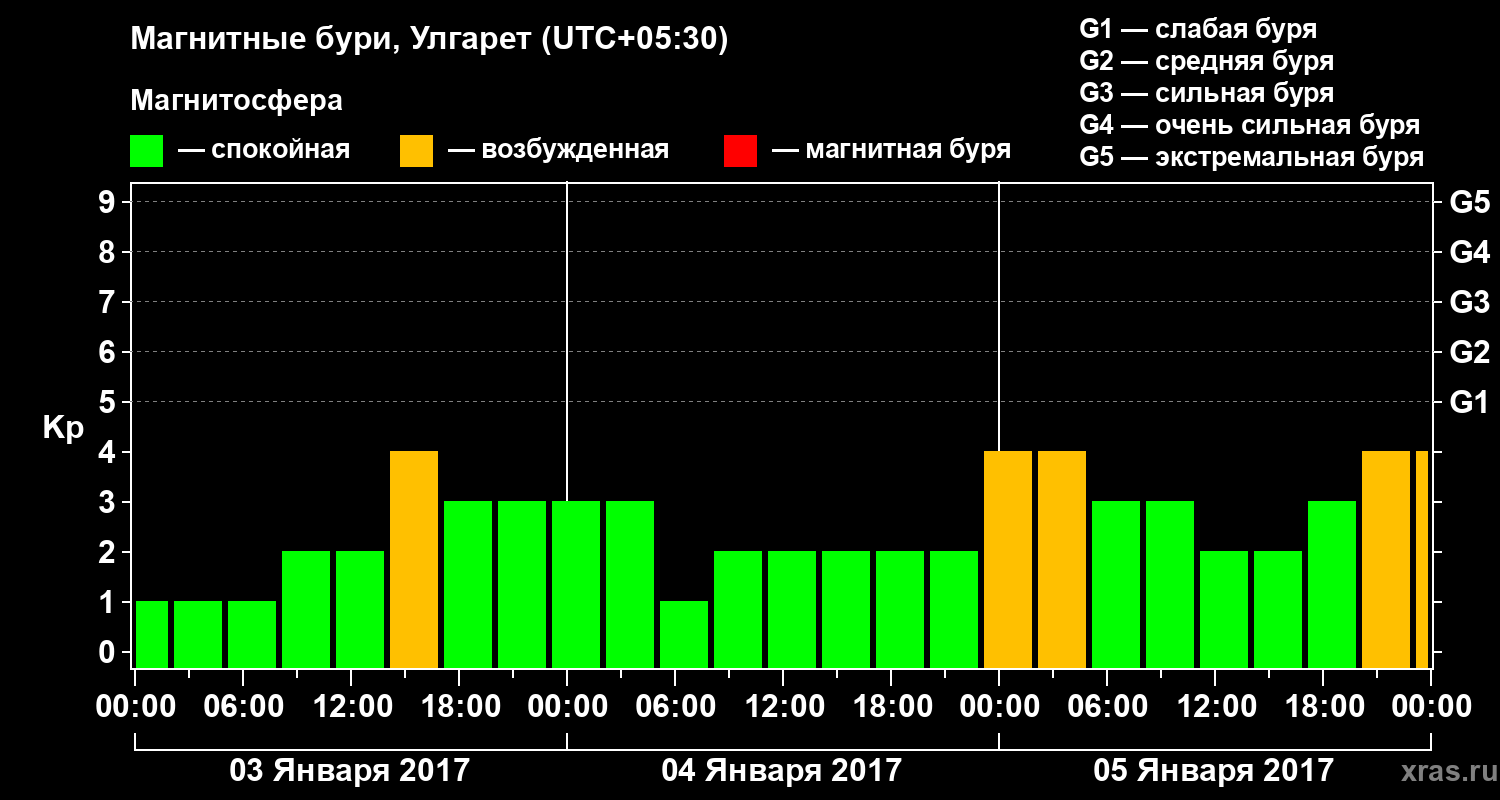 Изменения геомагнитного индекса Kp с 3 по 5 января 2017 года для средних широт
