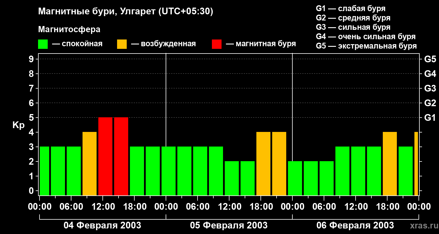 Изменения геомагнитного индекса Kp с 4 по 6 февраля 2003 года для средних широт