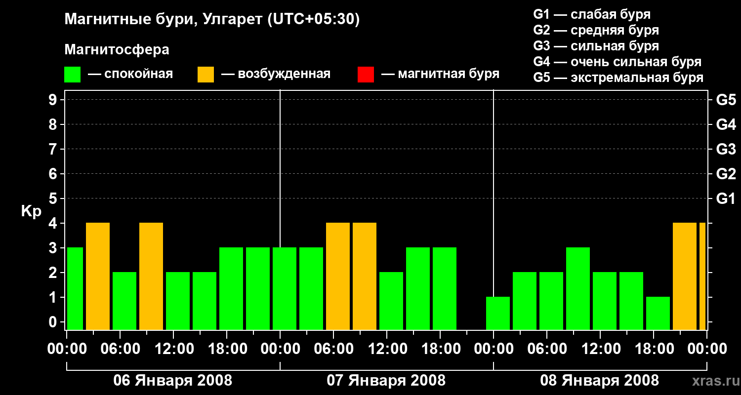 Изменения геомагнитного индекса Kp с 6 по 8 января 2008 года для средних широт