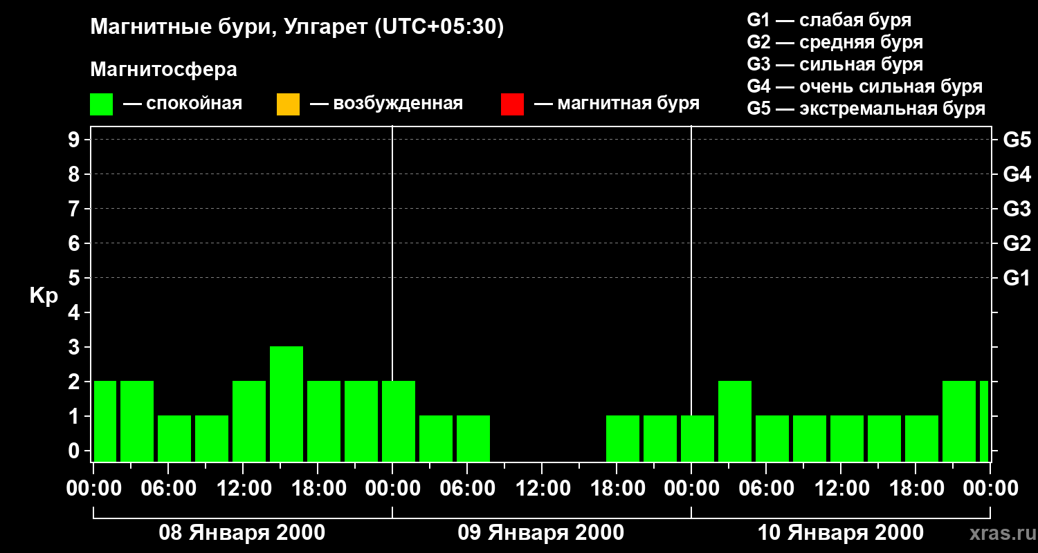 Изменения геомагнитного индекса Kp с 8 по 10 января 2000 года для средних широт