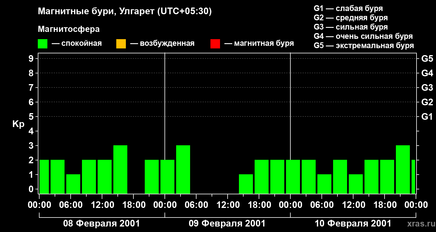 Изменения геомагнитного индекса Kp с 8 по 10 февраля 2001 года для средних широт