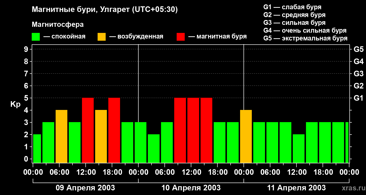Изменения геомагнитного индекса Kp с 9 по 11 апреля 2003 года для средних широт