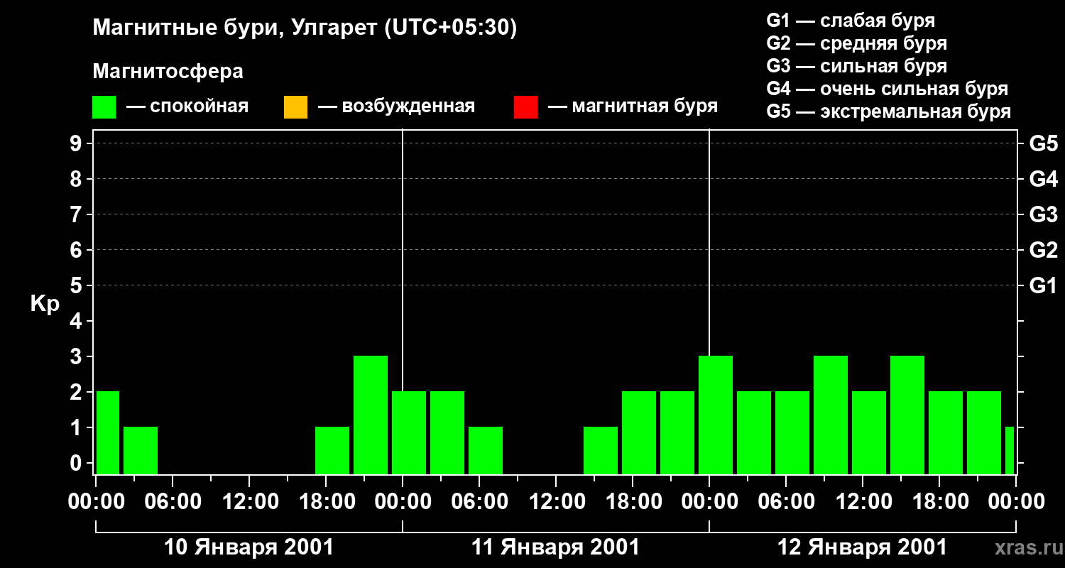 Изменения геомагнитного индекса Kp с 10 по 12 января 2001 года для средних широт