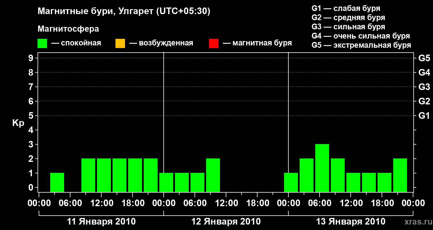 Изменения геомагнитного индекса Kp с 11 по 13 января 2010 года для средних широт