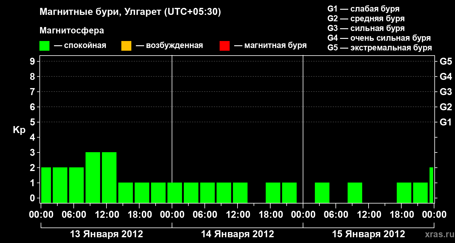 Изменения геомагнитного индекса Kp с 13 по 15 января 2012 года для средних широт