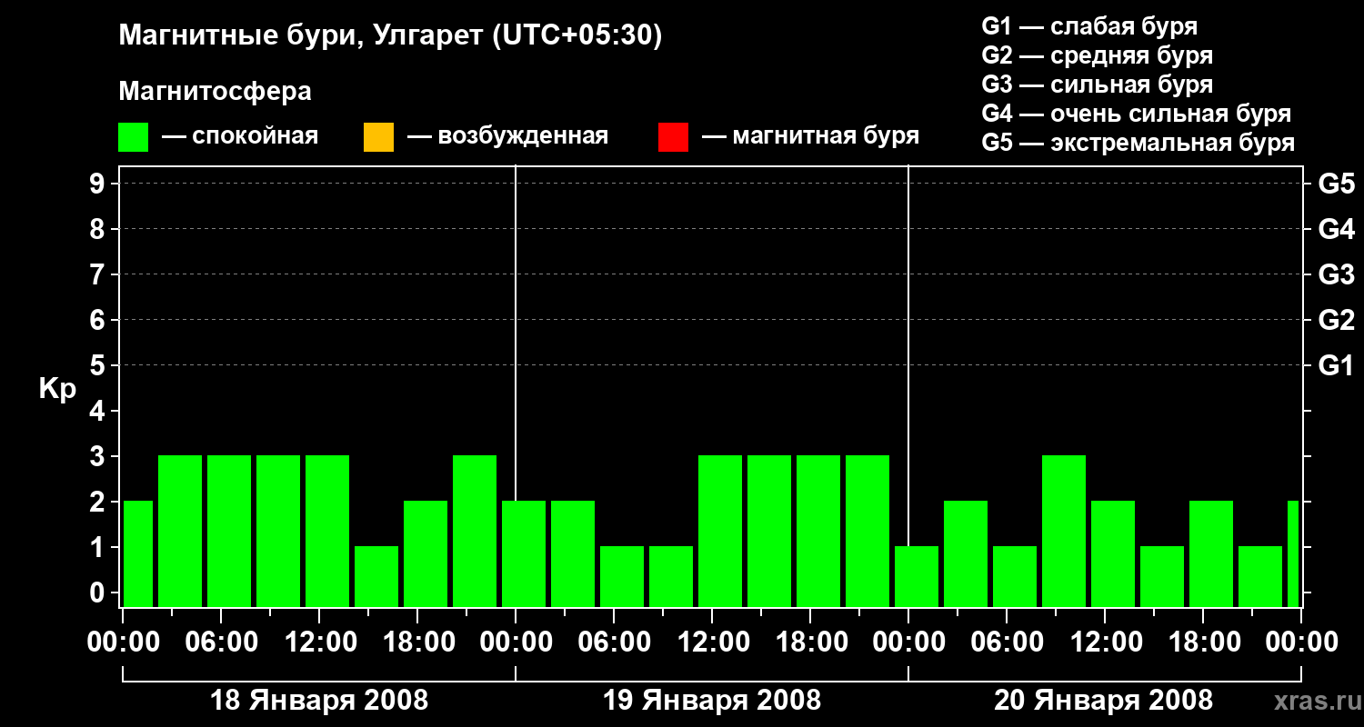 Изменения геомагнитного индекса Kp с 18 по 20 января 2008 года для средних широт