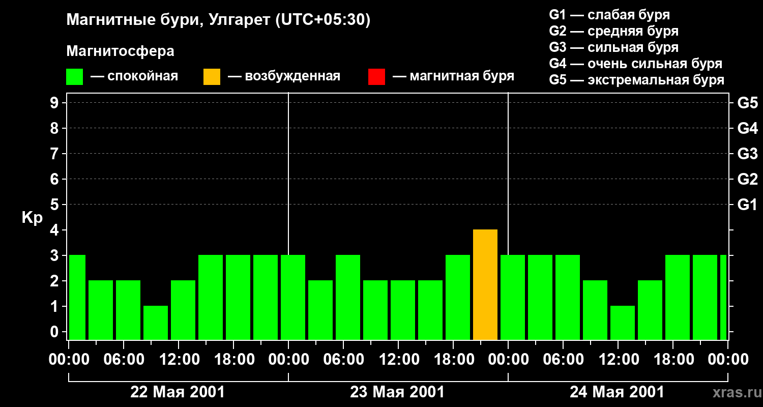 Изменения геомагнитного индекса Kp с 22 по 24 мая 2001 года для средних широт