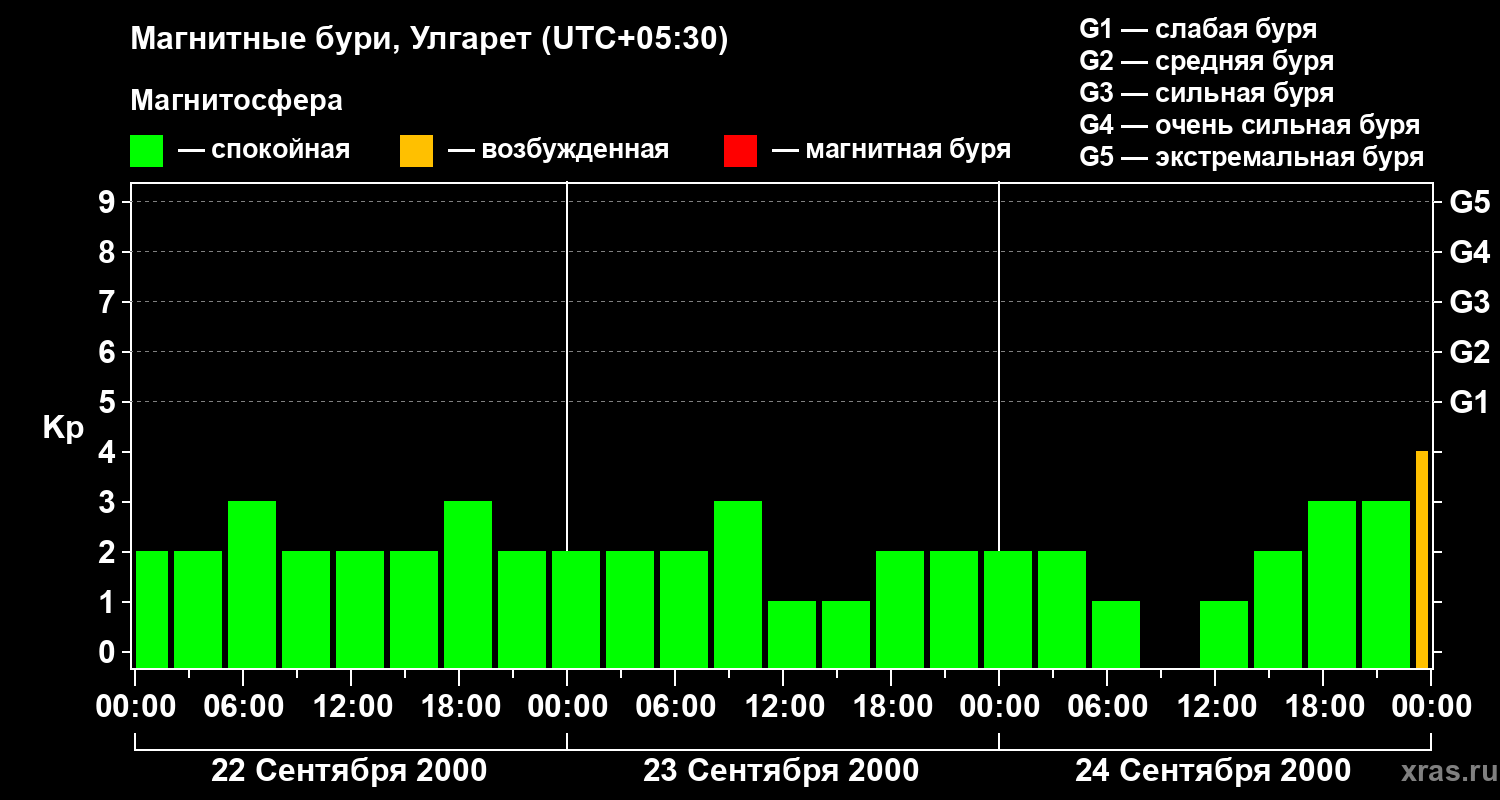 Изменения геомагнитного индекса Kp с 22 по 24 сентября 2000 года для средних широт
