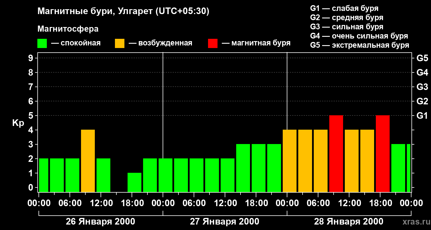 Изменения геомагнитного индекса Kp с 26 по 28 января 2000 года для средних широт