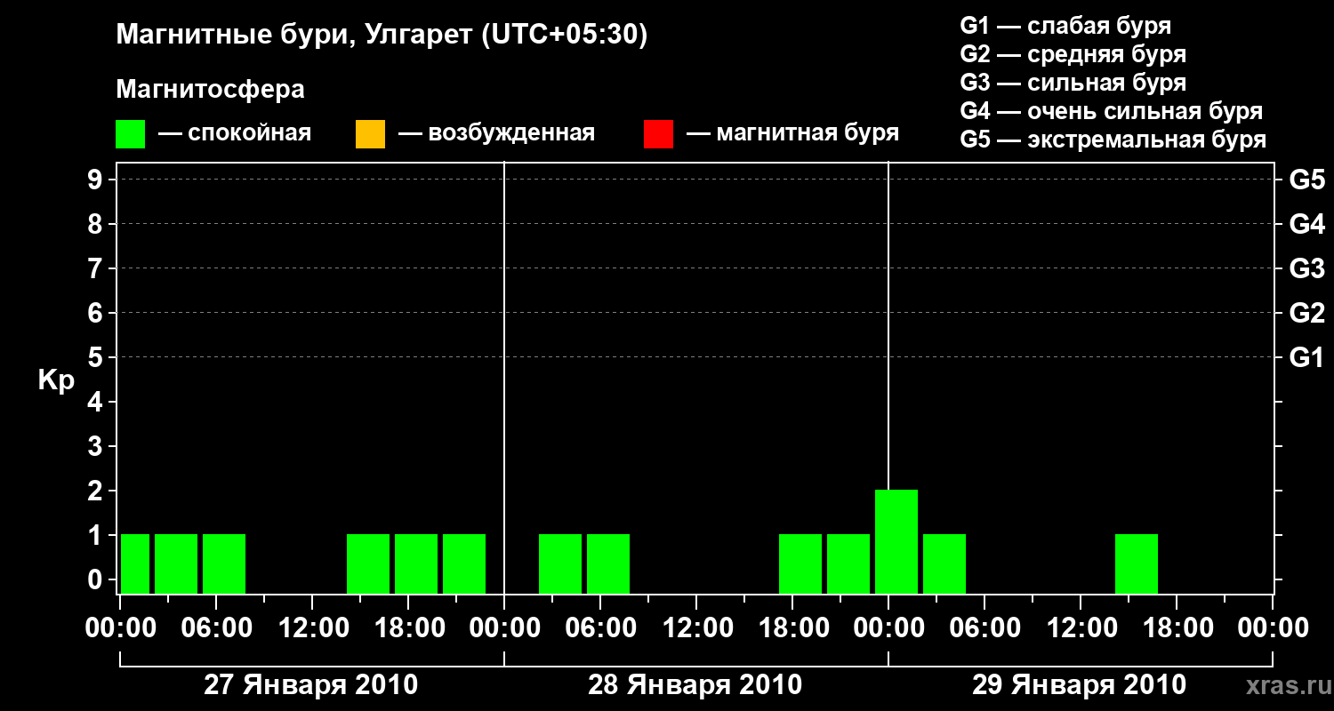 Изменения геомагнитного индекса Kp с 27 по 29 января 2010 года для средних широт